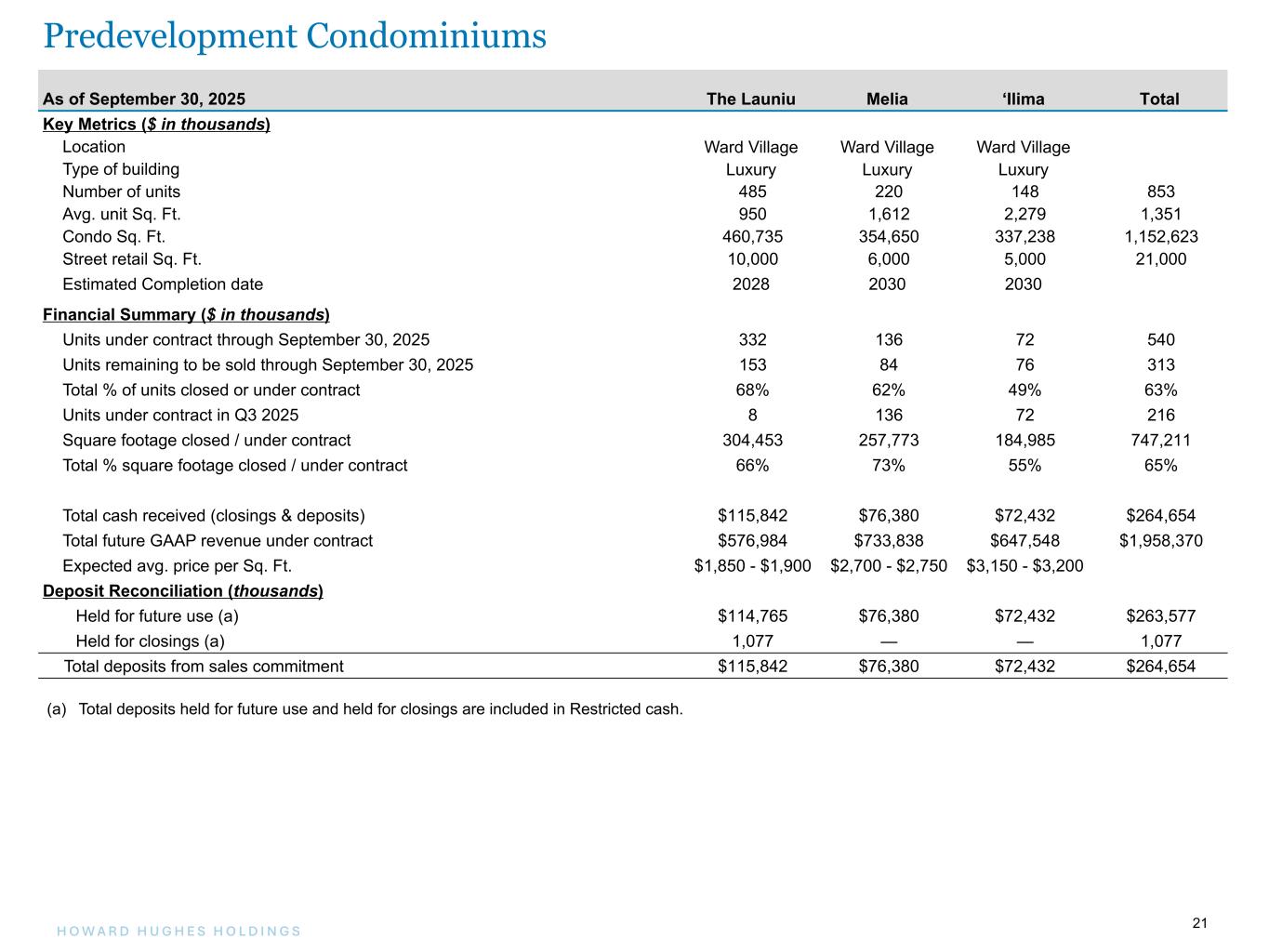 20H O W A R D H U G H E S H O L D I N G S 20 As of September 30, 2025 The Park Ward Village Ulana Ward Village Kalae Ritz-Carlton Residences Total Key Metrics ($ in thousands) Location Ward Village Ward Village Ward Village The Woodlands Type of building Upscale Workforce Luxury Luxury Number of units 545 696 329 111 1,681 Avg. unit Sq. Ft. 847 623 1,207 2,524 935 Condo Sq. Ft. 461,360 433,773 397,203 280,172 1,572,508 Street retail Sq. Ft. 26,800 32,100 2,000 5,800 66,700 Stabilized retail NOI $1,900 $760 $140 $800 $3,600 Stabilization year 2029 2028 2030 2030 Development progress ($ in thousands) Start date Q4 2022 Q1 2023 Q2 2024 Q4 2024 Estimated Completion date 2026 Q4 2025 2028 2027 Total estimated development cost $613,807 $402,914 $623,745 $369,465 $2,009,931 Development costs incurred to date 434,510 343,466 176,683 108,402 1,063,061 Estimated remaining to be spent $179,297 $59,448 $447,062 $261,063 $946,870 Financial Summary ($ in thousands) Units under contract through September 30, 2025 529 694 307 82 1,612 Units remaining to be sold through September 30, 2025 16 2 22 29 69 Total % of units closed or under contract 97% 100% 93% 74% 96% Units under contract in Q3 2025 — (1) — 4 3 Square footage closed / under contract 448,656 432,419 378,170 212,799 1,472,044 Total % square footage closed / under contract 97% 100% 95% 76% 94% Total cash received (closings & deposits) $141,880 $56,281 $157,576 $36,104 $391,841 Total future GAAP revenue under contract $705,082 $374,345 $775,999 $372,775 $2,228,201 Expected avg. price per Sq. Ft. $1,500 - $1,550 $850 - $900 $2,000 - $2,050 $1,750 - $1,800 Deposit Reconciliation (thousands) Spent towards construction $137,296 $37,258 $89,878 $— $264,432 Held for future use (a) 615 — 63,525 — 64,140 Held for closings (a) 3,969 19,023 4,173 36,104 63,269 Total deposits from sales commitment $141,880 $56,281 $157,576 $36,104 $391,841 (a) Total deposits held for future use and held for closings are included in Restricted cash. Under Construction Condominiums