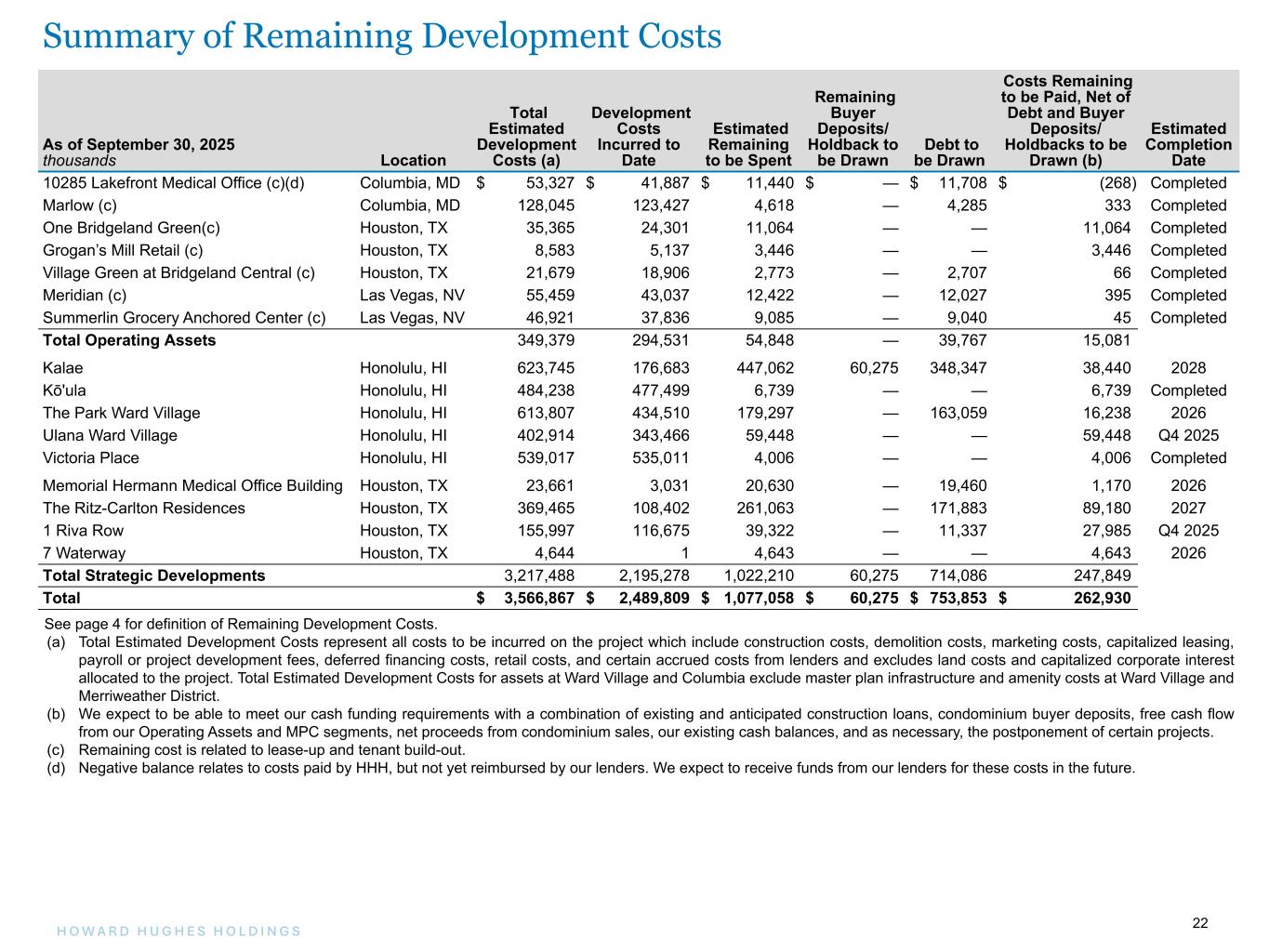 22H O W A R D H U G H E S H O L D I N G S 22 As of September 30, 2025 thousands Location Total Estimated Development Costs (a) Development Costs Incurred to Date Estimated Remaining to be Spent Remaining Buyer Deposits/ Holdback to be Drawn Debt to be Drawn Costs Remaining to be Paid, Net of Debt and Buyer Deposits/ Holdbacks to be Drawn (b) Estimated Completion Date 10285 Lakefront Medical Office (c)(d) Columbia, MD $ 53,327 $ 41,887 $ 11,440 $ — $ 11,708 $ (268) Completed Marlow (c) Columbia, MD 128,045 123,427 4,618 — 4,285 333 Completed One Bridgeland Green(c) Houston, TX 35,365 24,301 11,064 — — 11,064 Completed Grogan’s Mill Retail (c) Houston, TX 8,583 5,137 3,446 — — 3,446 Completed Village Green at Bridgeland Central (c) Houston, TX 21,679 18,906 2,773 — 2,707 66 Completed Meridian (c) Las Vegas, NV 55,459 43,037 12,422 — 12,027 395 Completed Summerlin Grocery Anchored Center (c) Las Vegas, NV 46,921 37,836 9,085 — 9,040 45 Completed Total Operating Assets 349,379 294,531 54,848 — 39,767 15,081 Kalae Honolulu, HI 623,745 176,683 447,062 60,275 348,347 38,440 2028 Kō'ula Honolulu, HI 484,238 477,499 6,739 — — 6,739 Completed The Park Ward Village Honolulu, HI 613,807 434,510 179,297 — 163,059 16,238 2026 Ulana Ward Village Honolulu, HI 402,914 343,466 59,448 — — 59,448 Q4 2025 Victoria Place Honolulu, HI 539,017 535,011 4,006 — — 4,006 Completed Memorial Hermann Medical Office Building Houston, TX 23,661 3,031 20,630 — 19,460 1,170 2026 The Ritz-Carlton Residences Houston, TX 369,465 108,402 261,063 — 171,883 89,180 2027 1 Riva Row Houston, TX 155,997 116,675 39,322 — 11,337 27,985 Q4 2025 7 Waterway Houston, TX 4,644 1 4,643 — — 4,643 2026 Total Strategic Developments 3,217,488 2,195,278 1,022,210 60,275 714,086 247,849 Total $ 3,566,867 $ 2,489,809 $ 1,077,058 $ 60,275 $ 753,853 $ 262,930 See page 4 for definition of Remaining Development Costs. (a) Total Estimated Development Costs represent all costs to be incurred on the project which include construction costs, demolition costs, marketing costs, capitalized leasing, payroll or project development fees, deferred financing costs, retail costs, and certain accrued costs from lenders and excludes land costs and capitalized corporate interest allocated to the project. Total Estimated Development Costs for assets at Ward Village and Columbia exclude master plan infrastructure and amenity costs at Ward Village and Merriweather District. (b) We expect to be able to meet our cash funding requirements with a combination of existing and anticipated construction loans, condominium buyer deposits, free cash flow from our Operating Assets and MPC segments, net proceeds from condominium sales, our existing cash balances, and as necessary, the postponement of certain projects. (c) Remaining cost is related to lease-up and tenant build-out. (d) Negative balance relates to costs paid by HHH, but not yet reimbursed by our lenders. We expect to receive funds from our lenders for these costs in the future. Summary of Remaining Development Costs