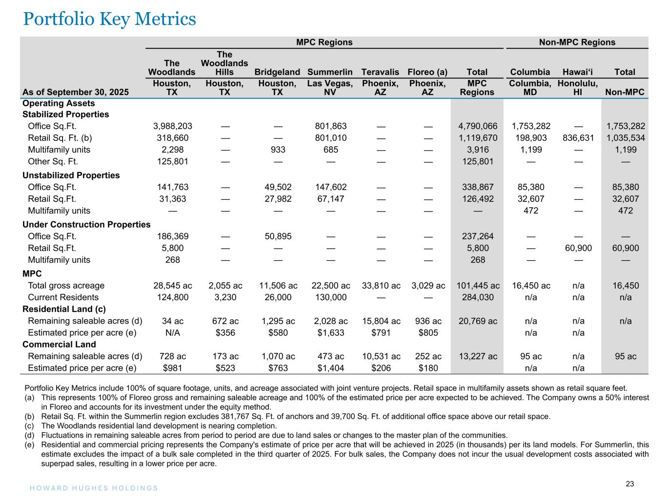 23H O W A R D H U G H E S H O L D I N G S 23 MPC Regions Non-MPC Regions The Woodlands The Woodlands Hills Bridgeland Summerlin Teravalis Floreo (a) Total Columbia Hawai‘i Total As of September 30, 2025 Houston, TX Houston, TX Houston, TX Las Vegas, NV Phoenix, AZ Phoenix, AZ MPC Regions Columbia, MD Honolulu, HI Non-MPC Operating Assets Stabilized Properties Office Sq.Ft. 3,988,203 — — 801,863 — — 4,790,066 1,753,282 — 1,753,282 Retail Sq. Ft. (b) 318,660 — — 801,010 — — 1,119,670 198,903 836,631 1,035,534 Multifamily units 2,298 — 933 685 — — 3,916 1,199 — 1,199 Other Sq. Ft. 125,801 — — — — — 125,801 — — — Unstabilized Properties Office Sq.Ft. 141,763 — 49,502 147,602 — — 338,867 85,380 — 85,380 Retail Sq.Ft. 31,363 — 27,982 67,147 — — 126,492 32,607 — 32,607 Multifamily units — — — — — — — 472 — 472 Under Construction Properties Office Sq.Ft. 186,369 — 50,895 — — — 237,264 — — — Retail Sq.Ft. 5,800 — — — — — 5,800 — 60,900 60,900 Multifamily units 268 — — — — — 268 — — — MPC Total gross acreage 28,545 ac 2,055 ac 11,506 ac 22,500 ac 33,810 ac 3,029 ac 101,445 ac 16,450 ac n/a 16,450 Current Residents 124,800 3,230 26,000 130,000 — — 284,030 n/a n/a n/a Residential Land (c) Remaining saleable acres (d) 34 ac 672 ac 1,295 ac 2,028 ac 15,804 ac 936 ac 20,769 ac n/a n/a n/a Estimated price per acre (e) N/A $356 $580 $1,633 $791 $805 n/a n/a Commercial Land Remaining saleable acres (d) 728 ac 173 ac 1,070 ac 473 ac 10,531 ac 252 ac 13,227 ac 95 ac n/a 95 ac Estimated price per acre (e) $981 $523 $763 $1,404 $206 $180 n/a n/a Portfolio Key Metrics Portfolio Key Metrics include 100% of square footage, units, and acreage associated with joint venture projects. Retail space in multifamily assets shown as retail square feet. (a) This represents 100% of Floreo gross and remaining saleable acreage and 100% of the estimated price per acre expected to be achieved. The Company owns a 50% interest in Floreo and accounts for its investment under the equity method. (b) Retail Sq. Ft. within the Summerlin region excludes 381,767 Sq. Ft. of anchors and 39,700 Sq. Ft. of additional office space above our retail space. (c) The Woodlands residential land development is nearing completion. (d) Fluctuations in remaining saleable acres from period to period are due to land sales or changes to the master plan of the communities. (e) Residential and commercial pricing represents the Company's estimate of price per acre that will be achieved in 2025 (in thousands) per its land models. For Summerlin, this estimate excludes the impact of a bulk sale completed in the third quarter of 2025. For bulk sales, the Company does not incur the usual development costs associated with superpad sales, resulting in a lower price per acre. Portfolio Key Metrics