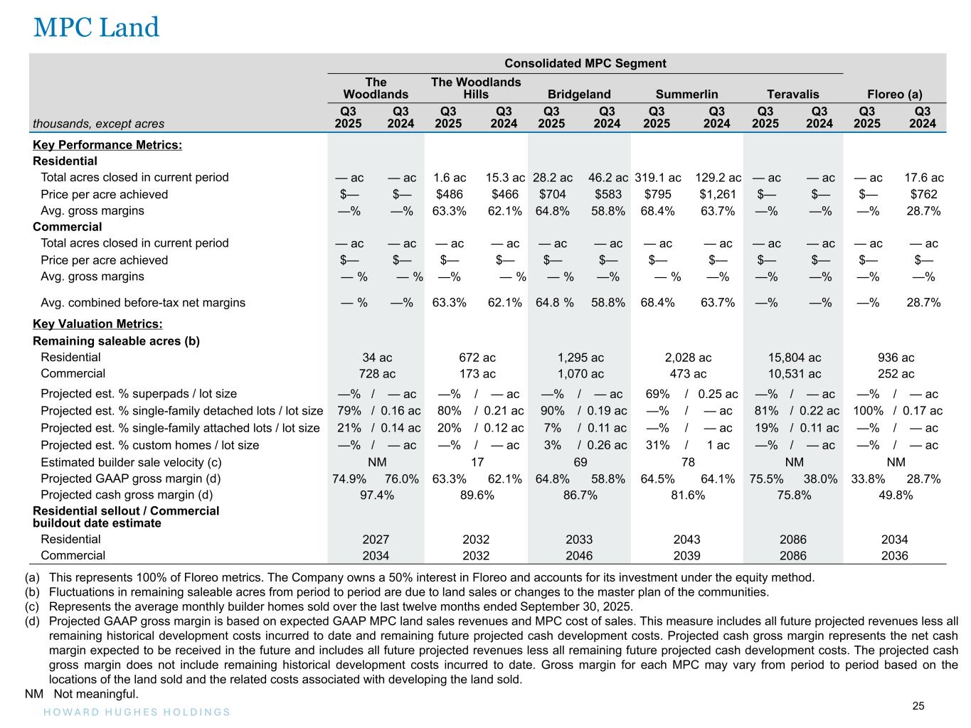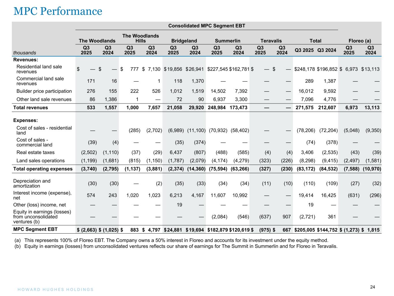 24H O W A R D H U G H E S H O L D I N G S 24 Master Planned Community Land Consolidated MPC Segment EBT The Woodlands The Woodlands Hills Bridgeland Summerlin Teravalis Total Floreo (a) thousands Q3 2025 Q3 2024 Q3 2025 Q3 2024 Q3 2025 Q3 2024 Q3 2025 Q3 2024 Q3 2025 Q3 2024 Q3 2025 Q3 2024 Q3 2025 Q3 2024 Revenues: Residential land sale revenues $ — $ — $ 777 $ 7,130 $ 19,856 $ 26,941 $ 227,545 $ 162,781 $ — $ — $ 248,178 $ 196,852 $ 6,973 $ 13,113 Commercial land sale revenues 171 16 — 1 118 1,370 — — — — 289 1,387 — — Builder price participation 276 155 222 526 1,012 1,519 14,502 7,392 — — 16,012 9,592 — — Other land sale revenues 86 1,386 1 — 72 90 6,937 3,300 — — 7,096 4,776 — — Total revenues 533 1,557 1,000 7,657 21,058 29,920 248,984 173,473 — — 271,575 212,607 6,973 13,113 Expenses: Cost of sales - residential land — — (285) (2,702) (6,989) (11,100) (70,932) (58,402) — — (78,206) (72,204) (5,048) (9,350) Cost of sales - commercial land (39) (4) — — (35) (374) — — — — (74) (378) — — Real estate taxes (2,502) (1,110) (37) (29) 6,437 (807) (488) (585) (4) (4) 3,406 (2,535) (43) (39) Land sales operations (1,199) (1,681) (815) (1,150) (1,787) (2,079) (4,174) (4,279) (323) (226) (8,298) (9,415) (2,497) (1,581) Total operating expenses (3,740) (2,795) (1,137) (3,881) (2,374) (14,360) (75,594) (63,266) (327) (230) (83,172) (84,532) (7,588) (10,970) Depreciation and amortization (30) (30) — (2) (35) (33) (34) (34) (11) (10) (110) (109) (27) (32) Interest income (expense), net 574 243 1,020 1,023 6,213 4,167 11,607 10,992 — — 19,414 16,425 (631) (296) Other (loss) income, net — — — — 19 — — — — — 19 — — — Equity in earnings (losses) from unconsolidated ventures (b) — — — — — — (2,084) (546) (637) 907 (2,721) 361 — — MPC Segment EBT $ (2,663) $ (1,025) $ 883 $ 4,797 $ 24,881 $ 19,694 $ 182,879 $ 120,619 $ (975) $ 667 $ 205,005 $ 144,752 $ (1,273) $ 1,815 (a) This represents 100% of Floreo EBT. The Company owns a 50% interest in Floreo and accounts for its investment under the equity method. (b) Equity in earnings (losses) from unconsolidated ventures reflects our share of earnings for The Summit in Summerlin and for Floreo in Teravalis. MPC Performance
