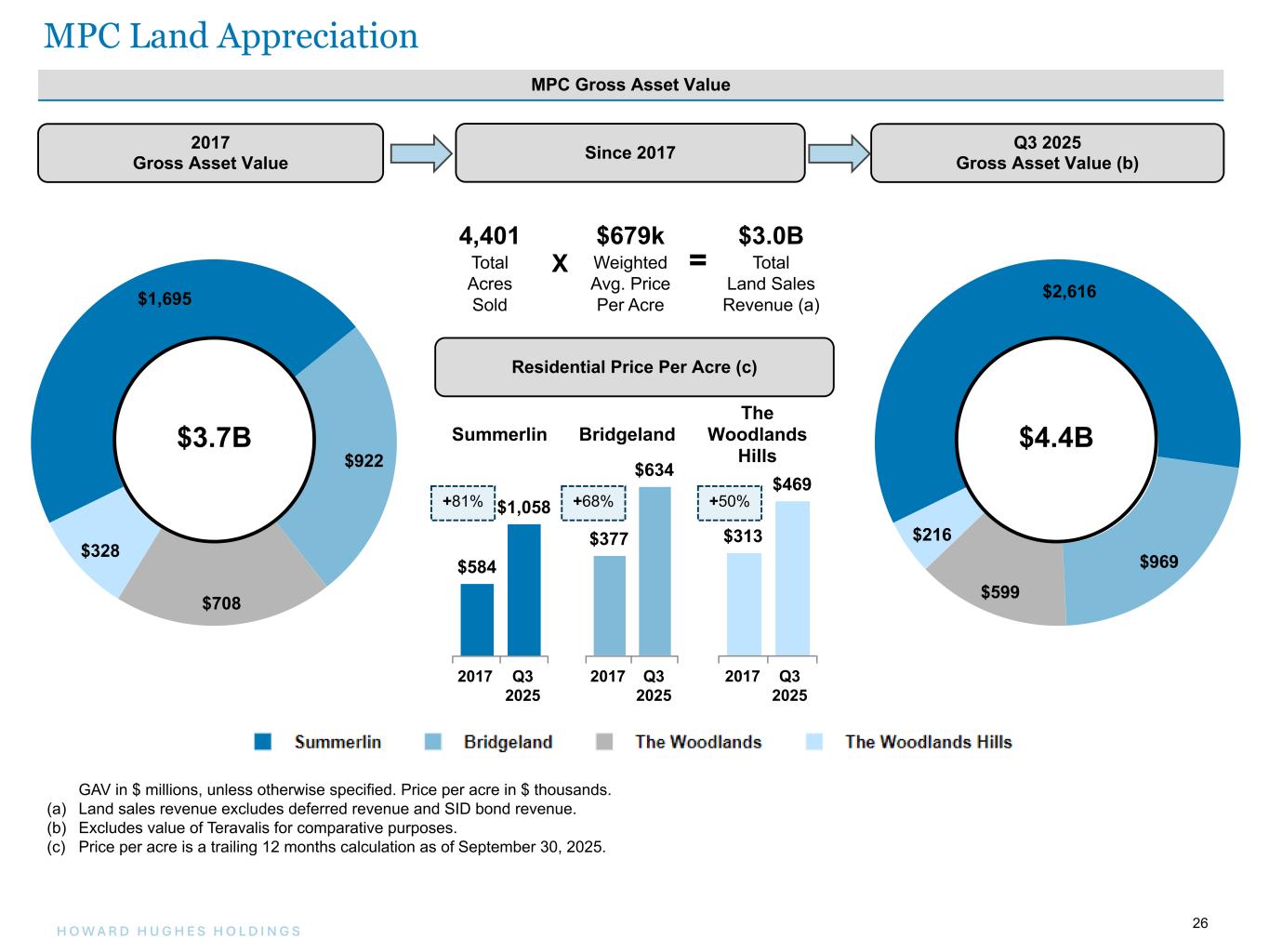 25H O W A R D H U G H E S H O L D I N G S 25 Master Planned Community Land Consolidated MPC Segment The Woodlands The Woodlands Hills Bridgeland Summerlin Teravalis Floreo (a) thousands, except acres Q3 2025 Q3 2024 Q3 2025 Q3 2024 Q3 2025 Q3 2024 Q3 2025 Q3 2024 Q3 2025 Q3 2024 Q3 2025 Q3 2024 Key Performance Metrics: Residential Total acres closed in current period — ac — ac 1.6 ac 15.3 ac 28.2 ac 46.2 ac 319.1 ac 129.2 ac — ac — ac — ac 17.6 ac Price per acre achieved $— $— $486 $466 $704 $583 $795 $1,261 $— $— $— $762 Avg. gross margins —% —% 63.3% 62.1% 64.8% 58.8% 68.4% 63.7% —% —% —% 28.7% Commercial Total acres closed in current period — ac — ac — ac — ac — ac — ac — ac — ac — ac — ac — ac — ac Price per acre achieved $— $— $— $— $— $— $— $— $— $— $— $— Avg. gross margins — % — % —% — % — % —% — % —% —% —% —% —% Avg. combined before-tax net margins — % —% 63.3% 62.1% 64.8 % 58.8% 68.4% 63.7% —% —% —% 28.7% Key Valuation Metrics: Remaining saleable acres (b) Residential 34 ac 672 ac 1,295 ac 2,028 ac 15,804 ac 936 ac Commercial 728 ac 173 ac 1,070 ac 473 ac 10,531 ac 252 ac Projected est. % superpads / lot size —% / — ac —% / — ac —% / — ac 69% / 0.25 ac —% / — ac —% / — ac Projected est. % single-family detached lots / lot size 79% / 0.16 ac 80% / 0.21 ac 90% / 0.19 ac —% / — ac 81% / 0.22 ac 100% / 0.17 ac Projected est. % single-family attached lots / lot size 21% / 0.14 ac 20% / 0.12 ac 7% / 0.11 ac —% / — ac 19% / 0.11 ac —% / — ac Projected est. % custom homes / lot size —% / — ac —% / — ac 3% / 0.26 ac 31% / 1 ac —% / — ac —% / — ac Estimated builder sale velocity (c) NM 17 69 78 NM NM Projected GAAP gross margin (d) 74.9% 76.0% 63.3% 62.1% 64.8% 58.8% 64.5% 64.1% 75.5% 38.0% 33.8% 28.7% Projected cash gross margin (d) 97.4% 89.6% 86.7% 81.6% 75.8% 49.8% Residential sellout / Commercial buildout date estimate Residential 2027 2032 2033 2043 2086 2034 Commercial 2034 2032 2046 2039 2086 2036 (a) This represents 100% of Floreo metrics. The Company owns a 50% interest in Floreo and accounts for its investment under the equity method. (b) Fluctuations in remaining saleable acres from period to period are due to land sales or changes to the master plan of the communities. (c) Represents the average monthly builder homes sold over the last twelve months ended September 30, 2025. (d) Projected GAAP gross margin is based on expected GAAP MPC land sales revenues and MPC cost of sales. This measure includes all future projected revenues less all remaining historical development costs incurred to date and remaining future projected cash development costs. Projected cash gross margin represents the net cash margin expected to be received in the future and includes all future projected revenues less all remaining future projected cash development costs. The projected cash gross margin does not include remaining historical development costs incurred to date. Gross margin for each MPC may vary from period to period based on the locations of the land sold and the related costs associated with developing the land sold. NM Not meaningful. MPC Land