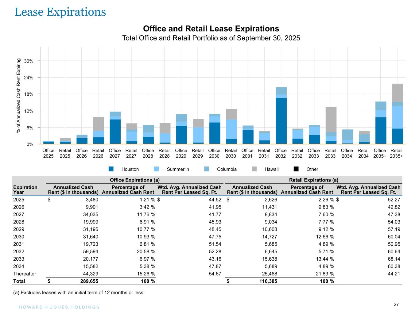 27H O W A R D H U G H E S H O L D I N G S 27 Office Expirations (a) Retail Expirations (a) Expiration Year Annualized Cash Rent ($ in thousands) Percentage of Annualized Cash Rent Wtd. Avg. Annualized Cash Rent Per Leased Sq. Ft. Annualized Cash Rent ($ in thousands) Percentage of Annualized Cash Rent Wtd. Avg. Annualized Cash Rent Per Leased Sq. Ft. 2025 $ 3,480 1.21 % $ 44.52 $ 2,626 2.26 % $ 52.27 2026 9,901 3.42 % 41.95 11,431 9.83 % 42.82 2027 34,035 11.76 % 41.77 8,834 7.60 % 47.38 2028 19,999 6.91 % 45.93 9,034 7.77 % 54.03 2029 31,195 10.77 % 48.45 10,608 9.12 % 57.19 2030 31,640 10.93 % 47.75 14,727 12.66 % 60.04 2031 19,723 6.81 % 51.54 5,685 4.89 % 50.95 2032 59,594 20.58 % 52.28 6,645 5.71 % 60.64 2033 20,177 6.97 % 43.16 15,638 13.44 % 68.14 2034 15,582 5.38 % 47.87 5,689 4.89 % 60.38 Thereafter 44,329 15.26 % 54.67 25,468 21.83 % 44.21 Total $ 289,655 100 % $ 116,385 100 % (a) Excludes leases with an initial term of 12 months or less. Office and Retail Lease Expirations Total Office and Retail Portfolio as of September 30, 2025 % o f A nn ua liz ed C as h R en t E xp iri ng Houston Summerlin Columbia Hawaii Other Office 2025 Retail 2025 Office 2026 Retail 2026 Office 2027 Retail 2027 Office 2028 Retail 2028 Office 2029 Retail 2029 Office 2030 Retail 2030 Office 2031 Retail 2031 Office 2032 Retail 2032 Office 2033 Retail 2033 Office 2034 Retail 2034 Office 2035+ Retail 2035+ 0% 6% 12% 18% 24% 30% Lease Expirations
