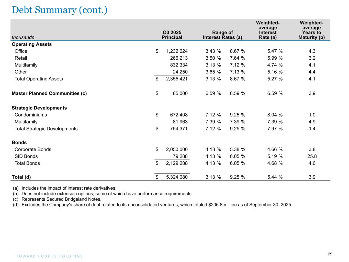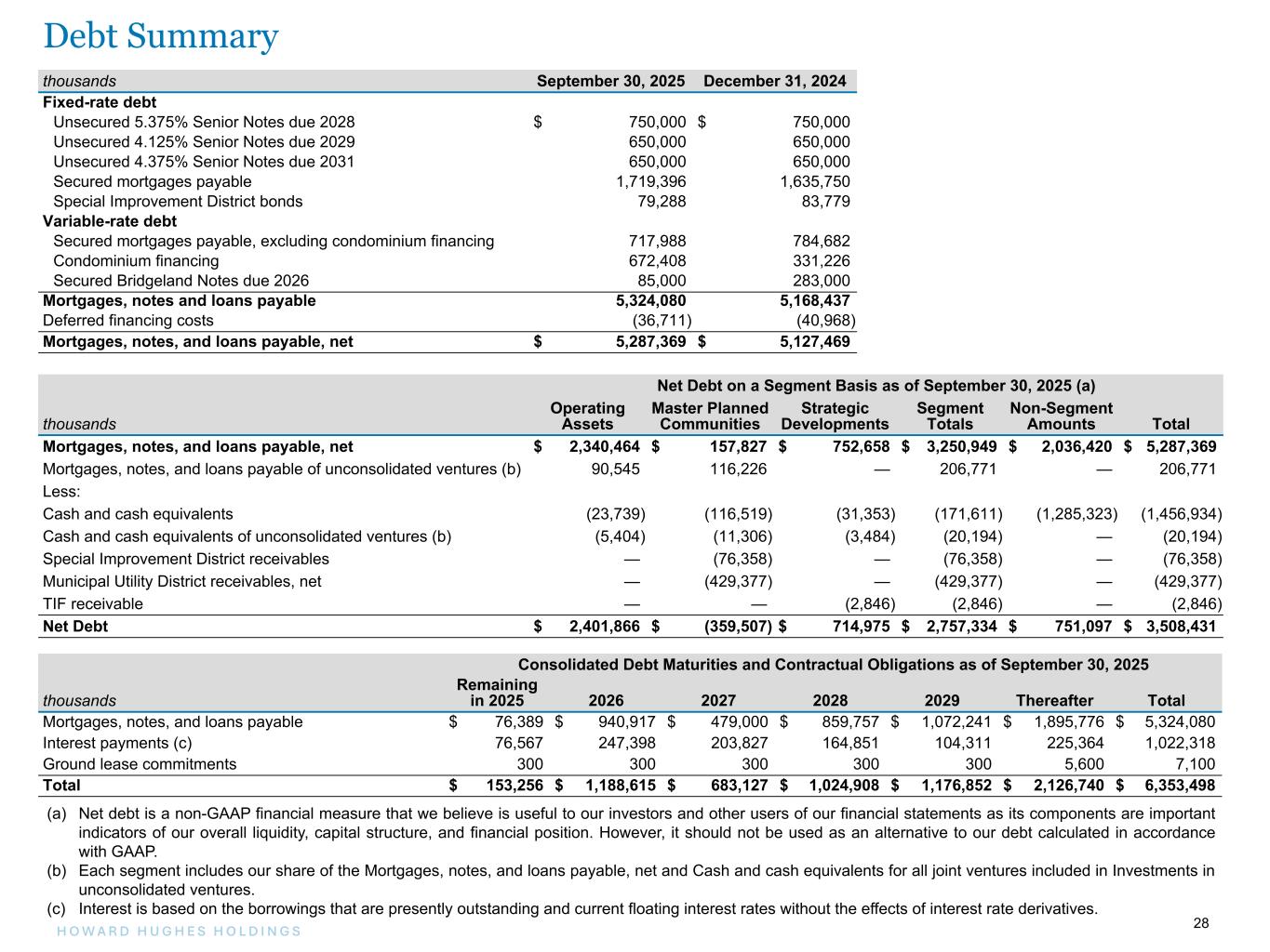 28H O W A R D H U G H E S H O L D I N G S 28 thousands September 30, 2025 December 31, 2024 Fixed-rate debt Unsecured 5.375% Senior Notes due 2028 $ 750,000 $ 750,000 Unsecured 4.125% Senior Notes due 2029 650,000 650,000 Unsecured 4.375% Senior Notes due 2031 650,000 650,000 Secured mortgages payable 1,719,396 1,635,750 Special Improvement District bonds 79,288 83,779 Variable-rate debt Secured mortgages payable, excluding condominium financing 717,988 784,682 Condominium financing 672,408 331,226 Secured Bridgeland Notes due 2026 85,000 283,000 Mortgages, notes and loans payable 5,324,080 5,168,437 Deferred financing costs (36,711) (40,968) Mortgages, notes, and loans payable, net $ 5,287,369 $ 5,127,469 Net Debt on a Segment Basis as of September 30, 2025 (a) thousands Operating Assets Master Planned Communities Strategic Developments Segment Totals Non-Segment Amounts Total Mortgages, notes, and loans payable, net $ 2,340,464 $ 157,827 $ 752,658 $ 3,250,949 $ 2,036,420 $ 5,287,369 Mortgages, notes, and loans payable of unconsolidated ventures (b) 90,545 116,226 — 206,771 — 206,771 Less: Cash and cash equivalents (23,739) (116,519) (31,353) (171,611) (1,285,323) (1,456,934) Cash and cash equivalents of unconsolidated ventures (b) (5,404) (11,306) (3,484) (20,194) — (20,194) Special Improvement District receivables — (76,358) — (76,358) — (76,358) Municipal Utility District receivables, net — (429,377) — (429,377) — (429,377) TIF receivable — — (2,846) (2,846) — (2,846) Net Debt $ 2,401,866 $ (359,507) $ 714,975 $ 2,757,334 $ 751,097 $ 3,508,431 Consolidated Debt Maturities and Contractual Obligations as of September 30, 2025 thousands Remaining in 2025 2026 2027 2028 2029 Thereafter Total Mortgages, notes, and loans payable $ 76,389 $ 940,917 $ 479,000 $ 859,757 $ 1,072,241 $ 1,895,776 $ 5,324,080 Interest payments (c) 76,567 247,398 203,827 164,851 104,311 225,364 1,022,318 Ground lease commitments 300 300 300 300 300 5,600 7,100 Total $ 153,256 $ 1,188,615 $ 683,127 $ 1,024,908 $ 1,176,852 $ 2,126,740 $ 6,353,498 (a) Net debt is a non-GAAP financial measure that we believe is useful to our investors and other users of our financial statements as its components are important indicators of our overall liquidity, capital structure, and financial position. However, it should not be used as an alternative to our debt calculated in accordance with GAAP. (b) Each segment includes our share of the Mortgages, notes, and loans payable, net and Cash and cash equivalents for all joint ventures included in Investments in unconsolidated ventures. (c) Interest is based on the borrowings that are presently outstanding and current floating interest rates without the effects of interest rate derivatives. Debt Summary