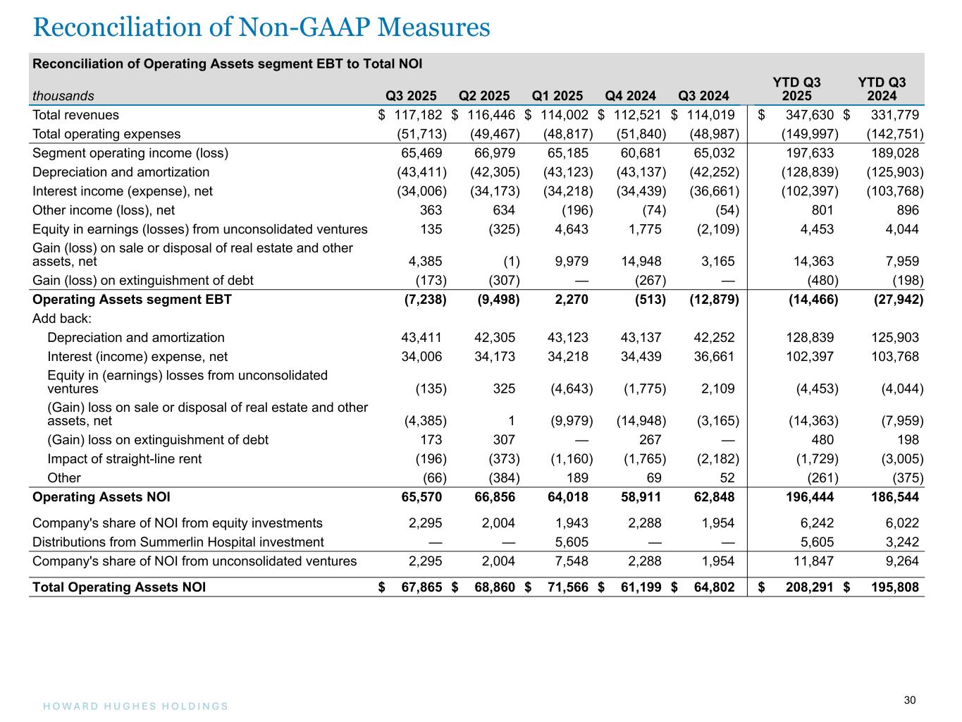 30H O W A R D H U G H E S H O L D I N G S 30 Reconciliation of Operating Assets segment EBT to Total NOI thousands Q3 2025 Q2 2025 Q1 2025 Q4 2024 Q3 2024 YTD Q3 2025 YTD Q3 2024 Total revenues $ 117,182 $ 116,446 $ 114,002 $ 112,521 $ 114,019 $ 347,630 $ 331,779 Total operating expenses (51,713) (49,467) (48,817) (51,840) (48,987) (149,997) (142,751) Segment operating income (loss) 65,469 66,979 65,185 60,681 65,032 197,633 189,028 Depreciation and amortization (43,411) (42,305) (43,123) (43,137) (42,252) (128,839) (125,903) Interest income (expense), net (34,006) (34,173) (34,218) (34,439) (36,661) (102,397) (103,768) Other income (loss), net 363 634 (196) (74) (54) 801 896 Equity in earnings (losses) from unconsolidated ventures 135 (325) 4,643 1,775 (2,109) 4,453 4,044 Gain (loss) on sale or disposal of real estate and other assets, net 4,385 (1) 9,979 14,948 3,165 14,363 7,959 Gain (loss) on extinguishment of debt (173) (307) — (267) — (480) (198) Operating Assets segment EBT (7,238) (9,498) 2,270 (513) (12,879) (14,466) (27,942) Add back: Depreciation and amortization 43,411 42,305 43,123 43,137 42,252 128,839 125,903 Interest (income) expense, net 34,006 34,173 34,218 34,439 36,661 102,397 103,768 Equity in (earnings) losses from unconsolidated ventures (135) 325 (4,643) (1,775) 2,109 (4,453) (4,044) (Gain) loss on sale or disposal of real estate and other assets, net (4,385) 1 (9,979) (14,948) (3,165) (14,363) (7,959) (Gain) loss on extinguishment of debt 173 307 — 267 — 480 198 Impact of straight-line rent (196) (373) (1,160) (1,765) (2,182) (1,729) (3,005) Other (66) (384) 189 69 52 (261) (375) Operating Assets NOI 65,570 66,856 64,018 58,911 62,848 196,444 186,544 Company's share of NOI from equity investments 2,295 2,004 1,943 2,288 1,954 6,242 6,022 Distributions from Summerlin Hospital investment — — 5,605 — — 5,605 3,242 Company's share of NOI from unconsolidated ventures 2,295 2,004 7,548 2,288 1,954 11,847 9,264 Total Operating Assets NOI $ 67,865 $ 68,860 $ 71,566 $ 61,199 $ 64,802 $ 208,291 $ 195,808 Reconciliation of Non-GAAP Measures