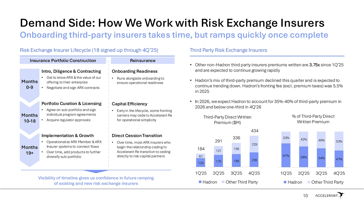 Demand Side: How We Work with Risk Exchange Insurers Onboarding third-party insurers takes time, but ramps quickly once complete Risk Exchange Insurer Lifecycle (18 signed up through 4Q’25) Third Party Risk Exchange Insurers Insurance Portfolio Construction Reinsurance • Other non-Hadron third party insurers premiums written are 3.75x since 1Q’25 and are expected to continue growing rapidly Intro, Diligence & Contracting Onboarding Readiness • Get to know ARX & the value of our • Runs alongside onboarding to • Hadron’s mix of third-party premium declined this quarter and is expected to Months offering to their enterprise ensure operational readiness continue trending down. Hadron’s fronting fee (excl. premium taxes) was 5.5% 0-9 • Negotiate and sign ARX contracts in 2025 • In 2026, we expect Hadron to account for 35%-40% of third-party premium in Portfolio Curation & Licensing Capital Efficiency 2026 and below one-third in 4Q’26 • Agree on sub-portfolio and sign • Early in the lifecycle, some fronting individual program agreements carriers may cede to Accelerant Re Months % of Third-Party Direct Third-Party Direct Written • Acquire regulator approvals for operational simplicity 10-18 Written Premium Premium ($M) 434 Implementation & Growth Direct Cession Transition 33% 336 42% 46% 291 53% • Operationalize ARX Member & ARX • Over time, most ARX insurers who 229 Insurer systems to connect flows begin the relationship ceding to Months 156 184 121 Accelerant Re transition to ceding • Over time, add products to further 19+ 67% directly to risk capital partners 61 diversify sub-portfolio 58% 54% 47% 205 180 170 123 1Q'25 2Q'25 3Q'25 4Q'25 1Q'25 2Q'25 3Q'25 4Q'25 Visibility of timeline gives us confidence in future ramping Hadron Other Third Party Hadron Other Third Party of existing and new risk exchange insurers 10