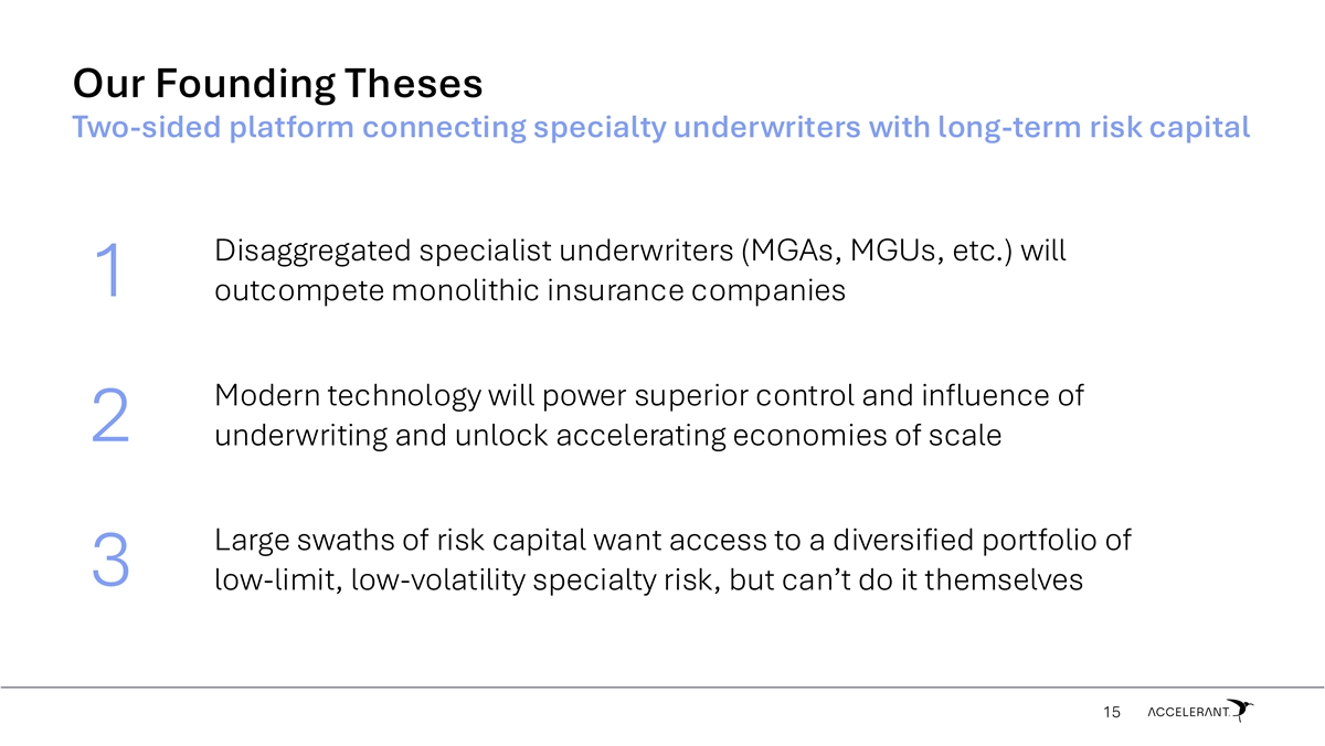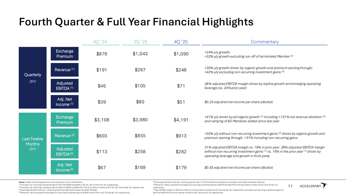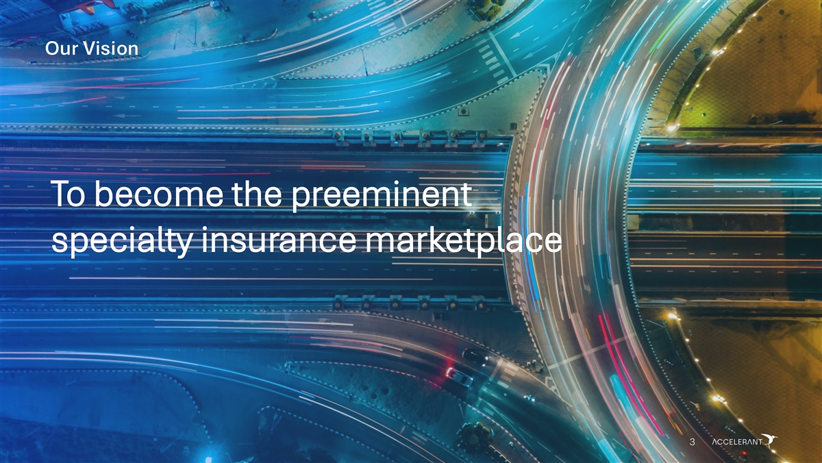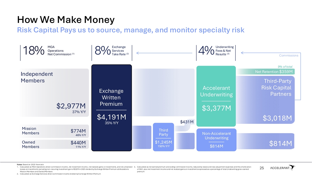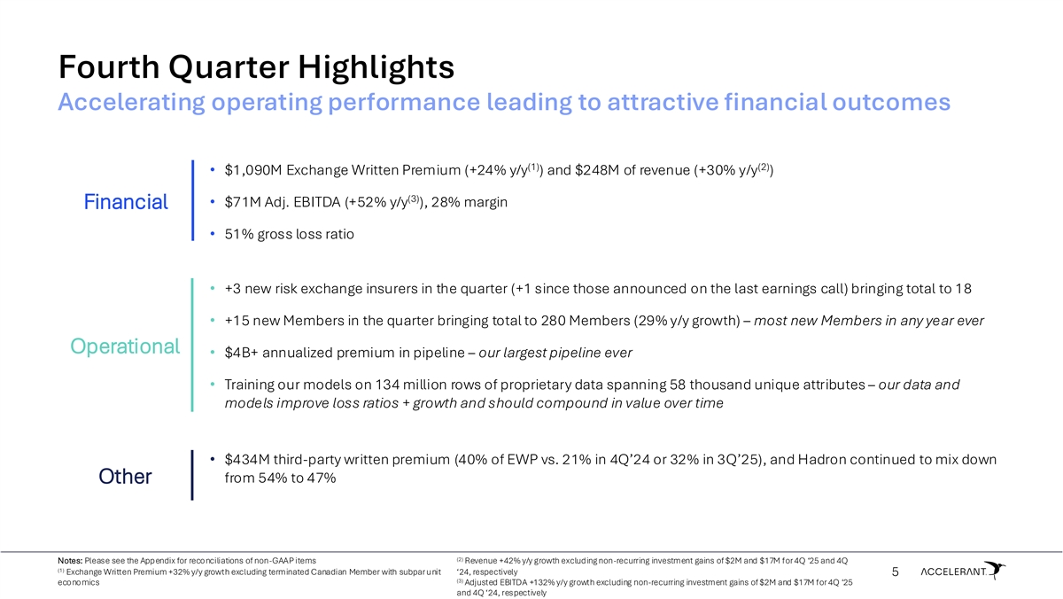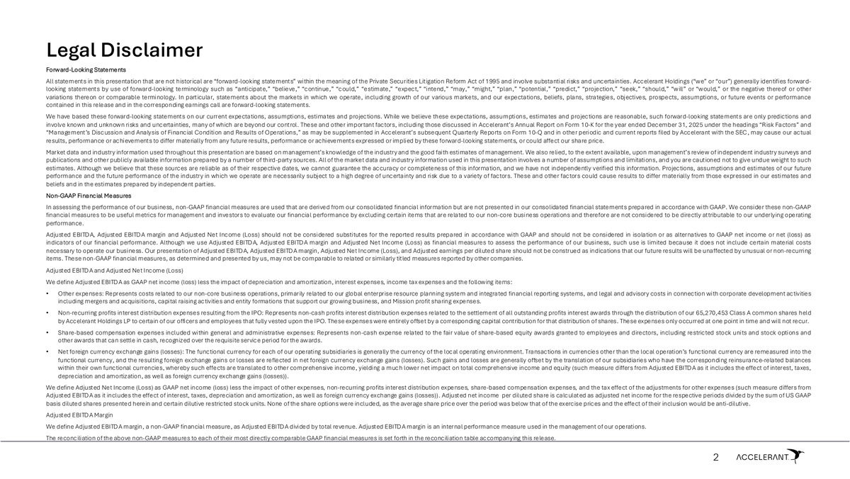 Legal Disclaimer Forward-Looking Statements All statements in this presentation that are not historical are “forward-looking statements” within the meaning of the Private Securities Litigation Reform Act of 1995 and involve substantial risks and uncertainties. Accelerant Holdings (“we” or “our”) generally identifies forward- looking statements by use of forward-looking terminology such as “anticipate,” “believe,” “continue,” “could,” “estimate,” “expect,” “intend,” “may,” “might,” “plan,” “potential,” “predict,” “projection,” “seek,” “should,” “w ill” or “would,” or the negative thereof or other variations thereon or comparable terminology. In particular, statements about the markets in which we operate, including growth of our various markets, and our expectations, beliefs, plans, strategies, objectives, prospects, assumptions, or future events or performance contained in this release and in the corresponding earnings call are forward-looking statements. We have based these forward-looking statements on our current expectations, assumptions, estimates and projections. While we believe these expectations, assumptions, estimates and projections are reasonable, such forward-looking statements are only predictions and involve known and unknown risks and uncertainties, many of which are beyond our control. These and other important factors, including those discussed in Accelerant’s Annual Report on Form 10-K for the year ended December 31, 2025 under the headings “R isk Factors” and “Management’s Discussion and Analysis of Financial Condition and Results of Operations,” as may be supplemented in Accelerant’s subsequent Quarterly Reports on Form 10-Q and in other periodic and current reports filed by Accelerant with the SEC , may cause our actual results, performance or achievements to differ materially from any future results, performance or achievements expressed or implied by these forward-looking statements, or could affect our share price. Market data and industry information used throughout this presentation are based on management’s knowledge of the industry and the good faith estimates of management. We also relied, to the extent available, upon management’s review of independent industry surveys and publications and other publicly available information prepared by a number of third-party sources. All of the market data and industry information used in this presentation involves a number of assumptions and limitations, and you are cautioned not to give undue weight to such estimates. Although we believe that these sources are reliable as of their respective dates, we cannot guarantee the accuracy or completeness of this information, and we have not independently verified this information. Projections, assumptions and estimates of our future performance and the future performance of the industry in which we operate are necessarily subject to a high degree of uncertainty and risk due to a variety of factors. These and other factors could cause results to differ materially from those expressed in our estimates and beliefs and in the estimates prepared by independent parties. Non-GAAP Financial Measures In assessing the performance of our business, non-GAAP financial measures are used that are derived from our consolidated financial information but are not presented in our consolidated financial statements prepared in accordance with GAAP. We consider these non-GAAP financial measures to be useful metrics for management and investors to evaluate our financial performance by excluding certain items that are related to our non-core business operations and therefore are not considered to be directly attributable to our underlying operating performance. Adjusted EBITD A, Adjusted EBITD A margin and Adjusted Net Income (Loss) should not be considered substitutes for the reported results prepared in accordance with GAAP and should not be considered in isolation or as alternatives to GAAP net income or net (loss) as indicators of our financial performance. Although we use Adjusted EBITD A, Adjusted EBITD A margin and Adjusted Net Income (Loss) as financial measures to assess the performance of our business, such use is limited because it does not include certain material costs necessary to operate our business. Our presentation of Adjusted EBITD A, Adjusted EBITD A margin, Adjusted Net Income (Loss), and Adjusted earnings per diluted share should not be construed as indications that our future results will be unaffected by unusual or non-recurring items. These non-GAAP financial measures, as determined and presented by us, may not be comparable to related or similarly titled measures reported by other companies. Adjusted EBITD A and Adjusted Net Income (Loss) We define Adjusted EBITD A as GAAP net income (loss) less the impact of depreciation and amortization, interest expenses, income tax expenses and the following items: • Other expenses: Represents costs related to our non-core business operations, primarily related to our global enterprise resource planning system and integrated financial reporting systems, and legal and advisory costs in connection with corporate development activities including mergers and acquisitions, capital raising activities and entity formations that support our growing business, and Mission profit sharing expenses. • Non-recurring profits interest distribution expenses resulting from the IPO: Represents non-cash profits interest distribution expenses related to the settlement of all outstanding profits interest awards through the distribution of our 65,270,453 Class A common shares held by Accelerant Holdings LP to certain of our officers and employees that fully vested upon the IPO. These expenses were entirely offset by a corresponding capital contribution for that distribution of shares. These expenses only occurred at one point in time and will not recur. • Sh