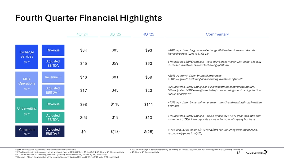 Fourth Quarter & Full Year Financial Highlights 4Q ‘24 3Q ‘25 4Q ‘25 Commentary Exchange +24% y/y growth; $1,043 $879 $1,090 (3) Premium +32% y/y growth excluding run-off of terminated Member +30% y/y growth driven by organic growth and premium earning through; (1) Revenue $191 $267 $248 (4) +42% y/y excluding non-recurring investment gains Quarterly ($M) Adjusted 28% adjusted EBITDA margin driven by topline growth and emerging operating $46 $105 $71 (1) leverage (vs. 24% prior year) EBITDA Adj. Net $80 $0.23 adjusted net income per share (diluted) $39 $51 (1) Income (5) (3) +41% y/y driven by all organic growth including +131% net revenue retention Exchange $3,108 $3,980 $4,191 and ramping of 63 Members added since last year Premium (6) +50% y/y without non-recurring investment gains driven by organic growth and (2) Revenue $855 $603 $913 premium earning through. +51% including non-recurring gains Last Twelve Months 31% adjusted EBITDA margin vs. 19% in prior year. 28% adjusted EBITDA margin ($M) Adjusted (7) (7) without non-recurring investment gains vs. 16% in the prior year driven by $258 $113 $282 (2) EBITDA operating leverage and growth in third-party Adj. Net $0.93 adjusted net income per share (diluted) $67 $169 $179 (2) Income (5) Notes: Please see the Appendix for re concilia tions of non-GAAP items. Exchange Written Premium +41% y/y growth and +131% Net Re ve nue Retention excludes terminated Ca na dian Member (1) (6) Includes non-recurring inve stment gains of $17M, $39M and $2M in 4Q ’24, 3Q ’25 and 4Q ’25, re spec tively Revenue +50% y/y growth excluding non-recurring inve stment gains of $41M and $21M for the last twelve months at 4Q ’25 and 4Q ’24, (2) 11 Includes non-recurring inve stment ga ins of $21M, $56M and $41M for the la st twelve months at 4Q ’24, 3Q ’25 and 4Q ’25, respect ively respe ctive ly (3) (7) Exchange Written Premium +32% y/y growth exc ludes te rminated Canadian Membe r Adj. EBITDA margin of 28% and 16% for the la st twe lve months a t 4Q ’ 25 a nd 4Q ’24, re spe ctivel y, exclude s non -recurring inve stment gains of (4) Revenue +42% y/y growth excluding non-recurring inve stment ga ins of $2M and $17M in 4Q ’25 and 4Q ’24, respectively $41M and $21M for the last twe lve months a t 4Q ’25 and 4Q ’ 24, respec tively