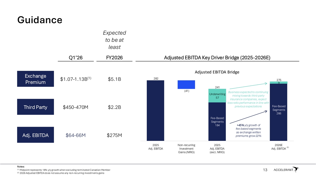 Fourth Quarter Financial Highlights 4Q ‘24 3Q ‘25 4Q ‘25 Commentary Revenue +46% y/y – driven by growth in Exchange Written Premium and take rate $64 $85 $93 Exchange increasing from 7.2% to 8.4% y/y Services Adjusted ($M) 67% adjusted EBITDA margin – near 100% gross margin with scale, offset by $59 $45 $63 increased investments in our technology platform EBITDA +28% y/y growth driven by premium growth; (1) Revenue $46 $81 $59 (3) +26% y/y growth excluding non-recurring investment gains MGA Operations 39% adjusted EBITDA margin as Mission platform continues to mature; Adjusted ($M) (4) 36% adjusted EBITDA margin excluding non-recurring investment gains vs. $45 $17 $23 (1) EBITDA (4) 35% in prior year +13% y/y – driven by net written premium growth and earning through written Revenue $118 $98 $111 premium Underwriting ($M) Adjusted 11% adjusted EBITDA margin – driven by healthy 51.4% gross loss ratio and $(5) $18 $13 movement of G&A into corporate as we write more third-party business EBITDA Adjusted Corporate 4Q‘24 and 3Q’25 include $16M and $9M non-recurring investment gains, $(13) $0 $(25) (2) respectively (none in 4Q’25) ($M) EBITDA (4) Notes: Please see the Appendix for reconciliations of non-GAAP items. Adj. EBITDA margin of 36% and 35% in 4Q ’25 and 4Q ’24, respectively, excludes non-recurring investment gains of $2M and $1M (1) MGA Operations includes non-recurring investment gains of $1M, $30M and $2M in 4Q ’24, 3Q ’25 and 4Q ’25, respectively in 4Q ’25 and 4Q ’24, respectively 12 (2) Corporate includes non-recurring investment gains of $16M and $9M in 4Q ’24 and 3Q ’25, respectively (3) Revenue +26% y/y growth excluding non-recurring investment gains of $2M and $1M in 4Q ’25 and 4Q ’24, respectively