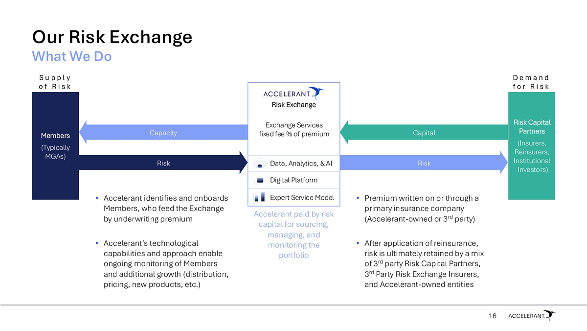 Our Founding Theses Two-sided platform connecting specialty underwriters with long-term risk capital Disaggregated specialist underwriters (MGAs, MGUs, etc.) will 1 outcompete monolithic insurance companies Modern technology will power superior control and influence of 2 underwriting and unlock accelerating economies of scale Large swaths of risk capital want access to a diversified portfolio of 3 low-limit, low-volatility specialty risk, but can’t do it themselves 15