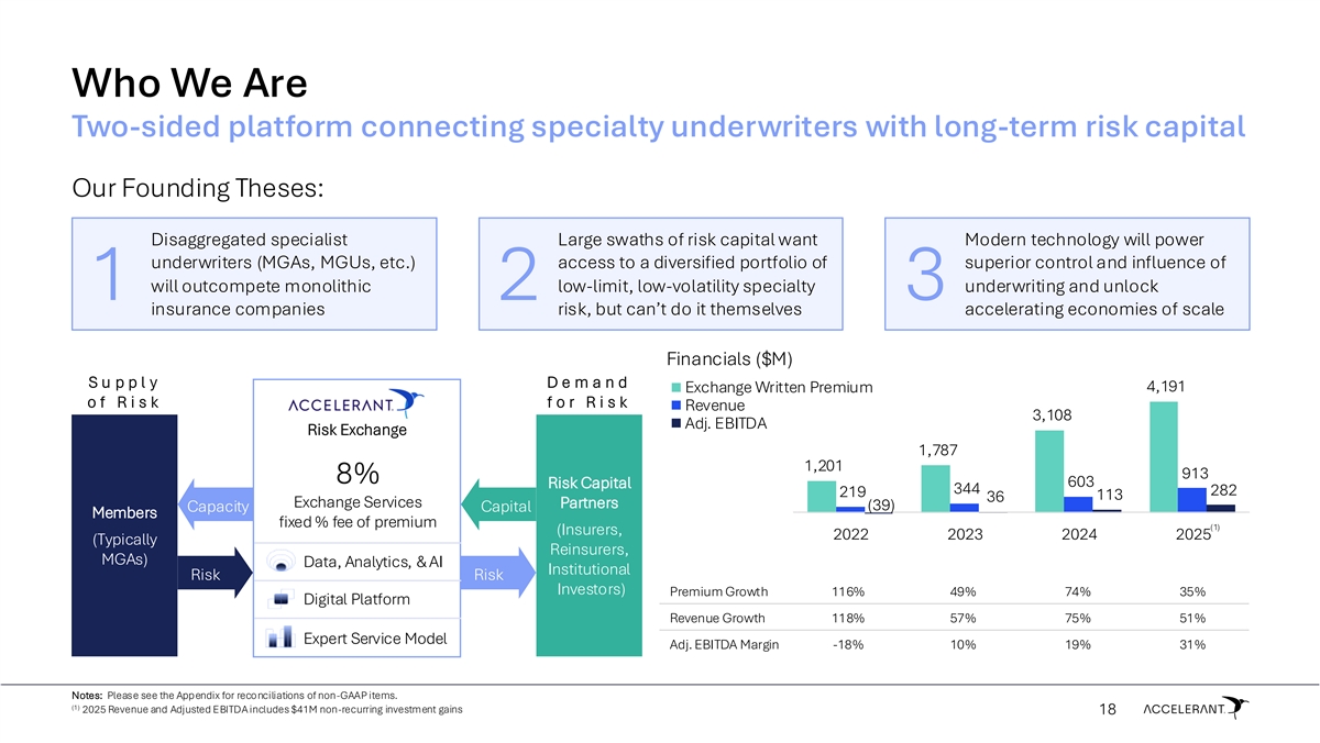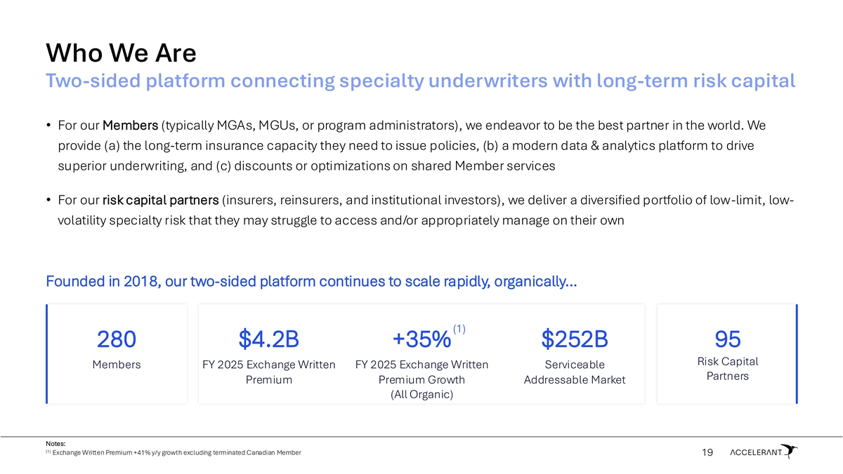 Who We Are Two-sided platform connecting specialty underwriters with long-term risk capital Our Founding Theses: Disaggregated specialist Large swaths of risk capital want Modern technology will power underwriters (MGAs, MGUs, etc.) access to a diversified portfolio of superior control and influence of will outcompete monolithic low-limit, low-volatility specialty underwriting and unlock 1 2 3 insurance companies risk, but can’t do it themselves accelerating economies of scale Financials ($M) S u p p l y D e m a n d Exchange Written Premium 4,191 o f R i s k f o r R i s k Revenue 3,108 Adj. EBITDA Risk Exchange 1,787 1,201 913 8% 603 Risk Capital 344 282 219 113 36 Exchange Services Partners (39) Capacity Capital Members fixed % fee of premium (1) (Insurers, 2022 2023 2024 2025 (Typically Reinsurers, MGAs) Data, Analytics, & AI Institutional Risk Risk Investors) Premium Growth 116% 49% 74% 35% Digital Platform Revenue Growth 118% 57% 75% 51% Expert Service Model Adj. EBITDA Margin -18% 10% 19% 31% Notes: Please see the Appendix for reconciliations of non-GAAP items. (1) 2025 Revenue and Adjusted EBITDA includes $41M non-recurring investment gains 18