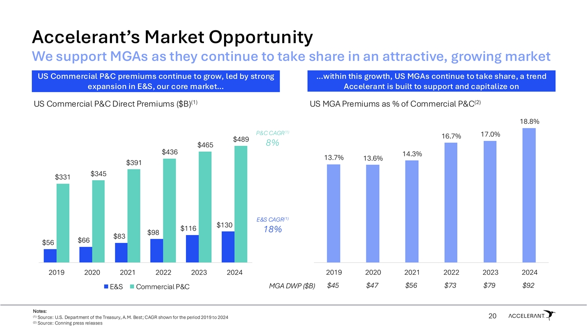Who We Are Two-sided platform connecting specialty underwriters with long-term risk capital • For our Members (typically MGAs, MGUs, or program administrators), we endeavor to be the best partner in the world. We provide (a) the long-term insurance capacity they need to issue policies, (b) a modern data & analytics platform to drive superior underwriting, and (c) discounts or optimizations on shared Member services • For our risk capital partners (insurers, reinsurers, and institutional investors), we deliver a diversified portfolio of low-limit, low- volatility specialty risk that they may struggle to access and/or appropriately manage on their own Founded in 2018, our two-sided platform continues to scale rapidly, organically… (1) 280 $4.2B +35% $252B 95 Risk Capital Members FY 2025 Exchange Written FY 2025 Exchange Written Serviceable Partners Premium Premium Growth Addressable Market (All Organic) Notes: (1) Exchange Written Premium +41% y/y growth excluding terminated Canadian Member 19