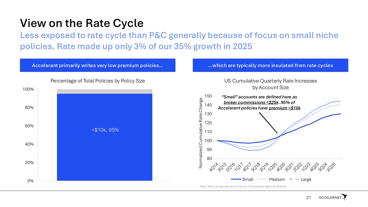 View on the Rate Cycle Less exposed to rate cycle than P&C generally because of focus on small niche policies. Rate made up only 3% of our 35% growth in 2025 Accelerant primarily writes very low premium policies… …which are typically more insulated from rate cycles Percentage of Total Policies by Policy Size US Cumulative Quarterly Rate Increases by Account Size 100% 150 “Small” accounts are defined here as broker commissions <$25k. 95% of 140 80% Accelerant policies have premium <$10k 130 120 60% <$10k, 95% 110 100 40% 90 80 20% Small Medium Large 0% Note: Rate change data from Council of Insurance Agents & Brokers 21 Normalized Cumulative Rate Change