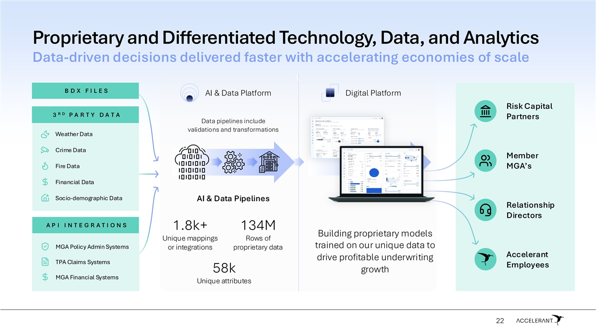 Proprietary and Differentiated Technology, Data, and Analytics Data-driven decisions delivered faster with accelerating economies of scale k B D X F I L E S AI & Data Platform Digital Platform Risk Capital RD 3 P A R T Y D A T A Partners Data pipelines include validations and transformations Weather Data Crime Data Member Fire Data MGA’s Financial Data Socio-demographic Data AI & Data Pipelines Relationship Directors A P I I N T E G R A T I O N S 1.8k+ 134M Building proprietary models Unique mappings Rows of trained on our unique data to MGA Policy Admin Systems or integrations proprietary data Accelerant drive profitable underwriting TPA Claims Systems Employees 58k growth MGA Financial Systems Unique attributes 22