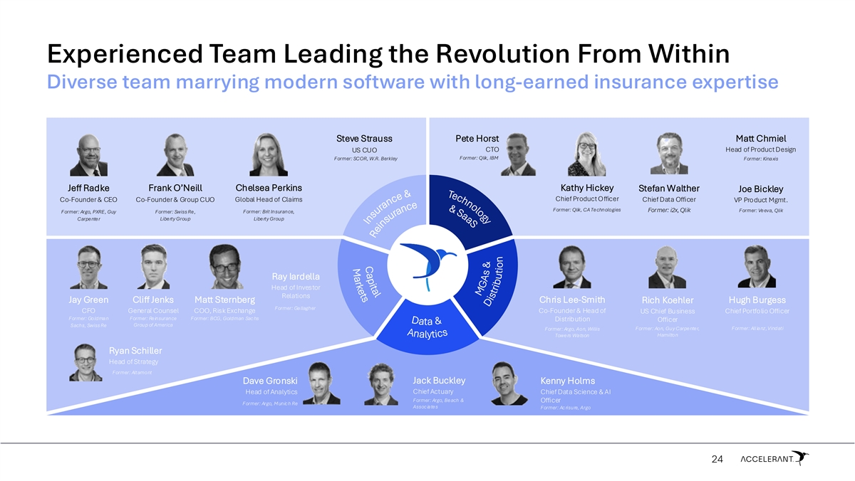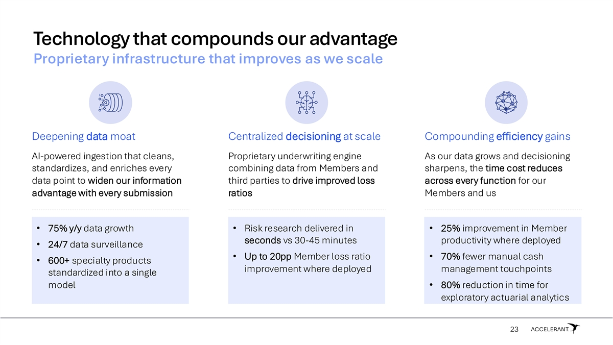 Technology that compounds our advantage Proprietary infrastructure that improves as we scale Deepening data moat Centralized decisioning at scale Compounding efficiency gains AI-powered ingestion that cleans, Proprietary underwriting engine As our data grows and decisioning standardizes, and enriches every combining data from Members and sharpens, the time cost reduces data point to widen our information third parties to drive improved loss across every function for our advantage with every submission ratios Members and us • 75% y/y data growth • Risk research delivered in • 25% improvement in Member seconds vs 30-45 minutes productivity where deployed • 24/7 data surveillance • Up to 20pp Member loss ratio • 70% fewer manual cash • 600+ specialty products improvement where deployed management touchpoints standardized into a single model • 80% reduction in time for exploratory actuarial analytics 23