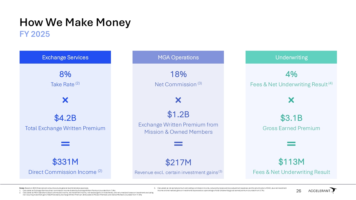 How We Make Money Risk Capital Pays us to source, manage, and monitor specialty risk MGA Exchange Underwriting Operations Services Fees & Net 18% (1) 8% (2) 4% (3) Net Commission Take Rate Results Commissions 9% of total Net Retention $359M Independent Members Third-Party Risk Capital Accelerant Exchange Partners Underwriting Written Premium $2,977M $3,377M 37% Y/Y $4,191M $3,018M $431M 35% Y/Y Mission Third $774M Members Non-Accelerant Party 46% Y/Y Underwriting Owned $1,245M $440M $814M 150% Y/Y $814M Members 11% Y/Y Notes: Base d on 2025 fina nc ia ls 1. Calculated as MGA Ope rations direct commission income , net investment inc ome , net real ized gains on investments, and net unrea lize d 3. Calculated as ne t ea rned pre mium and ce ding c ommission income, reduce d by losse s a nd loss adjustment expe nses and the a mortiz ation 25 losses on inve stme nts exc luding non-recurring inve stment gain of $32M in 2025 divide d by Exchange Written Premium attributable to of DAC, plus ne t investment inc ome and net re alize d gains on inve stments e xpre ssed as a percentage of total Underwriting gros s earne d Mission Me mbe rs and Owne d Me mbe rs premium 2. Calculated as Exchange Servic es direc t commission income divided by Exc hange W ritte n Premium