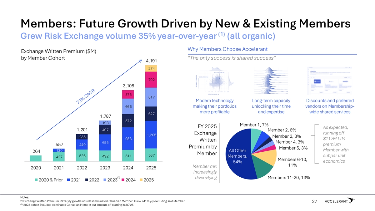 How We Make Money FY 2025 Exchange Services MGA Operations Underwriting 8% 18% 4% (2) (3) (4) Take Rate Net Commission Fees & Net Underwriting Result $1.2B $4.2B $3.1B Exchange Written Premium from Total Exchange Written Premium Gross Earned Premium Mission & Owned Members $331M $113M $217M (2) (3) Direct Commission Income Revenue excl. certain investment gains Fees & Net Underwriting Result Notes : Based on 2025 financials (all amounts exclude gener al & administ rat ive expenses). 3. Calculated as net earned premium and ceding commission income, reduced by losses and loss adjustment expenses and the amortization of DAC, plus net investment 1. Calculated as Exchange Services direct commission income divided by Exchange Wr itten Premium (rounded from 7.9%) income and net r ealized gains on investments expressed as a percentage of total Underwr iting gr oss earned premium (rounded fr om 3.7%) 26 2. Calculated as MGA Operations direct commission income, net investment income, net realized gains on investment s, and net unrealized losses on investments excluding non-recurr ing investment gain of $32M divided by Exchange Written Premium attr ibutable to Mission Members and Owned Members (rounded from 17.8%)