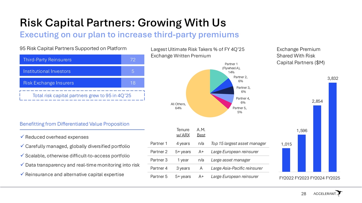 Members: Future Growth Driven by New & Existing Members (1) Grew Risk Exchange volume 35% year-over-year (all organic) Why Members Choose Accelerant Exchange Written Premium ($M) by Member Cohort “The only success is shared success” 4,191 274 702 3,108 375 817 Modern technology Long-term capacity Discounts and preferred 666 making their portfolios unlocking their time vendors on Membership- more profitable and expertise wide shared services 627 1,787 572 193 Member 1, 7% FY 2025 As expected, 1,201 407 Member 2, 6% running off Exchange 1,205 Member 3, 3% 235 983 $117M LTM Written Member 4, 3% 695 premium 557 440 Premium by Member 5, 3% Member with 130 All Other 264 Member 567 526 subpar unit 492 511 Members, 427 Members 6-10, economics 54% 11% Member mix 2020 2021 2022 2023 2024 2025 increasingly (2) Members 11-20, 13% diversifying 2020 & Prior 2021 2022 2023 2024 2025 Notes: (1) Exchange Written Premium +35% y/y growth includes terminated Canadian Member. Grew +41% y/y excluding said Member 27 (2) 2023 cohort includes terminated Canadian Member put into run-off starting in 3Q’25