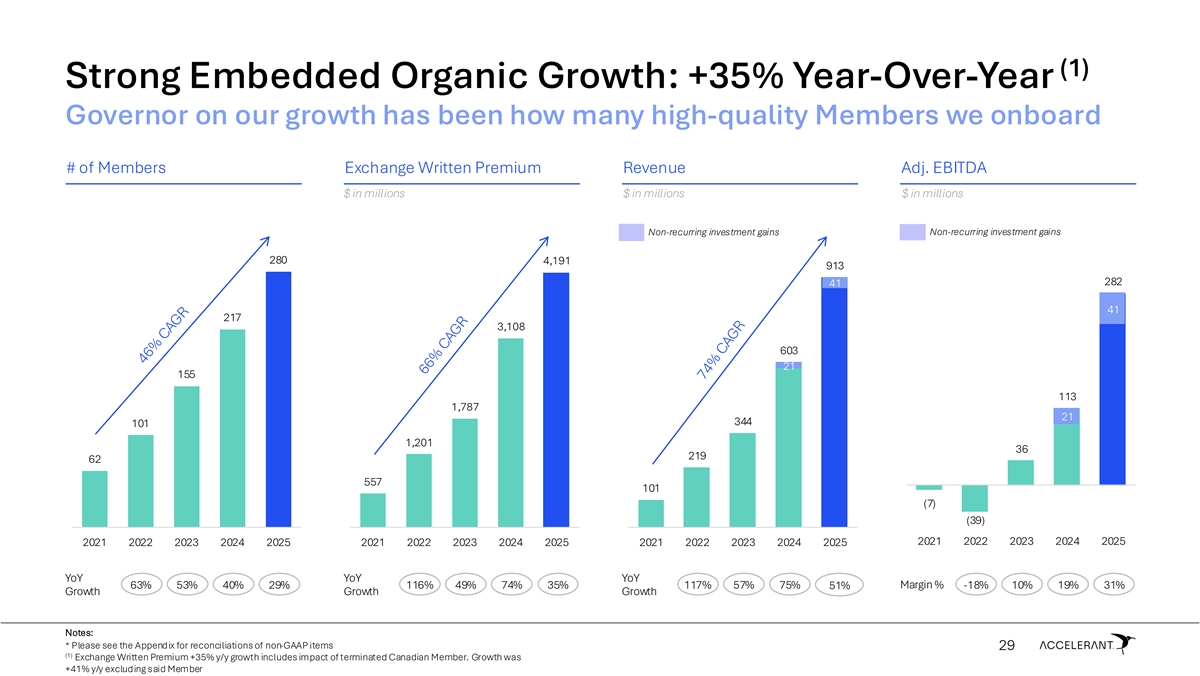 (1) Strong Embedded Organic Growth: +35% Year-Over-Year Governor on our growth has been how many high-quality Members we onboard # of Members Exchange Written Premium Revenue Adj. EBITDA $ in millions $ in millions $ in millions Non-recurring investment gains Non-recurring investment gains 280 4,191 913 282 41 41 217 3,108 603 21 155 113 1,787 21 344 101 1,201 36 219 62 557 101 (7) (39) 2021 2022 2023 2024 2025 2021 2022 2023 2024 2025 2021 2022 2023 2024 2025 2021 2022 2023 2024 2025 YoY YoY YoY 63% 53% 40% 29% 116% 49% 74% 35% 117% 57% 75% Margin % -18% 10% 19% 31% 51% Growth Growth Growth Notes: * Please see the Appendix for reconciliations of non-GAAP items 29 (1) Exchange Written Premium +35% y/y growth includes impact of terminated Canadian Member. Growth was +41% y/y excluding said Member