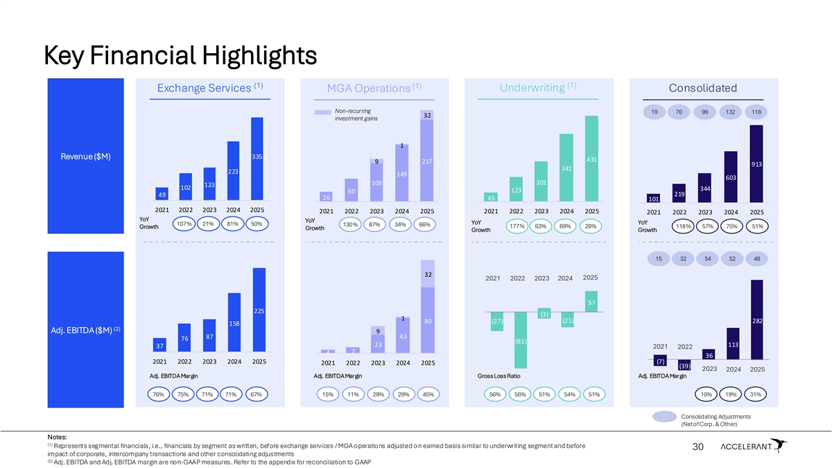 Key Financial Highlights (1) (1) (1) Exchange Services MGA Operations Underwriting Consolidated Non-recurring 19 70 99 132 118 32 investment gains 1 335 Revenue ($M) 431 9 217 913 341 223 149 603 201 103 123 102 344 123 60 49 219 26 45 101 2021 2022 2023 2024 2025 2021 2022 2023 2024 2025 2021 2022 2023 2024 2025 2021 2022 2023 2024 2025 YoY YoY YoY YoY 107% 21% 81% 50% 130% 87% 34% 66% 177% 63% 69% 26% Growth 118% 57% 75% 51% Growth Growth Growth 15 32 54 52 48 32 2025 2021 2022 2023 2024 57 225 (3) 1 80 (27) (21) 282 158 (2) Adj. EBITDA ($M) 9 87 43 76 (81) 23 113 37 2021 2022 7 4 36 2021 2022 2023 2024 2025 (7) 2021 2022 2023 2024 2025 (39) 2023 2024 2025 Adj. EBITDA Margin Adj. EBITDA Margin Gross Loss Ratio Adj. EBITDA Margin 76% 75% 71% 71% 67% 15% 11% 29% 29% 45% 56% 56% 51% 54% 51% 10% 19% 31% Consolidating Adjustments (Net of Corp. & Other) Notes: (1) Represents segmental financials, i.e., financials by segment as written, before exchange services / MGA operations adjusted o n earned basis similar to underwriting segment and before 30 impact of corporate, intercompany transactions and other consolidating adjustments (2) Adj. EBITDA and Adj. EBITDA margin are non-GAAP measures. Refer to the appendix for reconciliation to GAAP