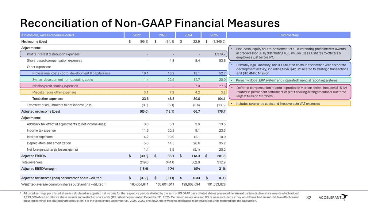 Reconciliation of Non-GAAP Financial Measures $ in millions, unless otherwise noted 2022 2023 2024 2025 Commentary Net income (loss) $ (95.6) $ (64.1) $ 22.9 $ (1,345.2) Adjustments: • Non-cash, equity neutral settlement of all outstanding profit interest awards in predecessor LP by distributing 65.3 million Class A shares to officers & Profits interest distribution expenses - - - 1,379.7 employees just before IPO Share-based compensation expenses - 4.8 8.4 53.6 • Primarily legal, advisory, and IPO-related costs in connection with corporate Other expenses: development activity, including M&A. $42.3M related to strategic transactions Professional costs - corp. development & capital raise 19.1 16.2 13.1 52.7 and $10.4M to Mission. System development non-operating costs 11.4 22.9 14.7 20.0 • Primarily global ERP system and integrated financial reporting systems Mission profit sharing expenses - - 7.0 27.6 • Deferred compensation related to profitable Mission series. Includes $15.6M related to permanent settlement of profit sharing arrangements for our three Miscellaneous other expenses 3.1 7.2 4.2 3.8 largest Mission Members. Total other expenses 33.6 46.3 39.0 104.1 • Includes severance costs and irrecoverable VAT expenses Tax effect of adjustments to net income (loss) (3.0) (5.1) (3.6) (13.5) Adjusted net income (loss) (65.0) (18.1) 66.7 178.7 Adjustments: Add back tax effect of adjustments to net income (loss) 3.0 5.1 3.6 13.5 Income tax expense 11.3 20.2 9.1 23.3 Interest expenses 4.2 10.9 12.1 10.9 Depreciation and amortization 5.8 14.5 26.6 35.2 Net foreign exchange losses (gains) 1.4 3.5 (5.1) 20.2 Adjusted EBITDA $ (39.3) $ 36.1 $ 113.0 $ 281.8 Total revenues 219.0 344.0 602.6 912.9 Adjusted EBITDA margin (18)% 10% 19% 31% Adjusted net income (loss) per common share – diluted $ (0.38) $ (0.11) $ 0.33 $ 0.93 (1) Weighted-average common shares outstanding – diluted 165,604,641 165,604,641 199,663,694 191,533,828 1. Adjusted earnings per diluted share is calculated as adjusted net income for the respective periods divided by the sum of US GAAP basis diluted shares presented herein and certain dilutive share awards which added 1,273,669 of certain dilutive share awards and restricted share units (RSUs) for the year ended December 31, 2025. Certain share options and RSUs were excluded as they would have had an anti-dilutive effect on our 32 adjusted earnings per diluted share calculation. For the years ended December 31, 2024, 2023, and 2022, there were no applica ble restrictive stock units factored into the calculation.