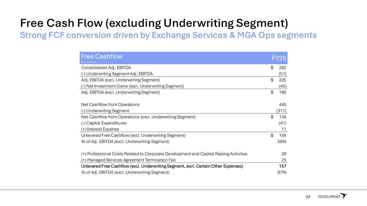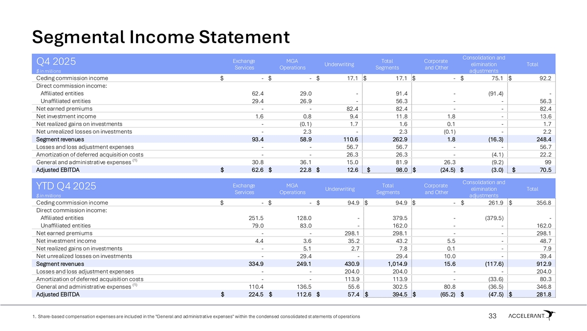 Segmental Income Statement Consolidation and Exchange MGA Total Corporate Q4 2025 Underwriting elimination Total Services Operations Segments and Other $ in millions adjustments Ceding commission income $ - $ - $ 17.1 $ 17.1 $ - $ 75.1 $ 92.2 Direct commission income: Affiliated entities 62.4 29.0 - 91.4 - (91.4) - Unaffiliated entities 29.4 26.9 - 56.3 - - 56.3 Net earned premiums - - 82.4 82.4 - - 82.4 Net investment income 1.6 0.8 9.4 11.8 1.8 - 13.6 Net realized gains on investments - (0.1) 1.7 1.6 0.1 - 1.7 Net unrealized losses on investments - 2.3 - 2.3 (0.1) - 2.2 Segment revenues 93.4 58.9 110.6 262.9 1.8 (16.3) 248.4 Losses and loss adjustment expenses - - 56.7 56.7 - - 56.7 Amortization of deferred acquisition costs - - 26.3 26.3 - (4.1) 22.2 (1) General and administrative expenses 30.8 36.1 15.0 81.9 26.3 (9.2) 99 Adjusted EBITDA $ 62.6 $ 22.8 $ 12.6 $ 98.0 $ (24.5) $ (3.0) $ 70.5 Consolidation and Exchange MGA Total Corporate YTD Q4 2025 Underwriting elimination Total Services Operations Segments and Other $ in millions adjustments Ceding commission income $ - $ - $ 94.9 $ 94.9 $ - $ 261.9 $ 356.8 Direct commission income: Affiliated entities 251.5 128.0 - 379.5 - (379.5) - Unaffiliated entities 79.0 83.0 - 162.0 - - 162.0 Net earned premiums - - 298.1 298.1 - - 298.1 Net investment income 4.4 3.6 35.2 43.2 5.5 - 48.7 Net realized gains on investments - 5.1 2.7 7.8 0.1 - 7.9 Net unrealized losses on investments - 29.4 - 29.4 10.0 - 39.4 Segment revenues 334.9 249.1 430.9 1,014.9 15.6 (117.6) 912.9 Losses and loss adjustment expenses - - 204.0 204.0 - - 204.0 Amortization of deferred acquisition costs - - 113.9 113.9 - (33.6) 80.3 (1) General and administrative expenses 110.4 136.5 55.6 302.5 80.8 (36.5) 346.8 Adjusted EBITDA $ 224.5 $ 112.6 $ 57.4 $ 394.5 $ (65.2) $ (47.5) $ 281.8 1. Share-based compensation expenses are included in the General and administrative expenses within the condensed consolidated st atements of operations 33