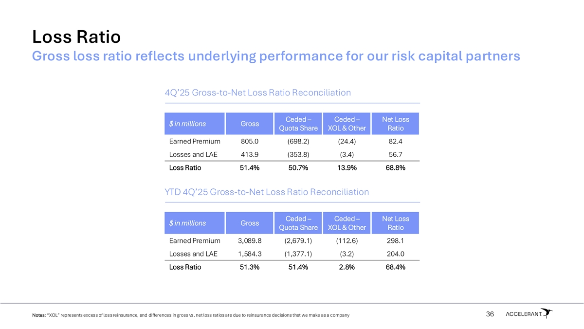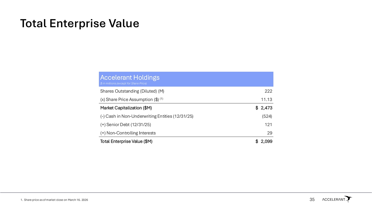 Total Enterprise Value Accelerant Holdings $ in millions (except for Share Price) Shares Outstanding (Diluted) (M) 222 (1) (x) Share Price Assumption ($) 11.13 Market Capitalization ($M) $ 2,473 (-) Cash in Non-Underwriting Entities (12/31/25) (524) (+) Senior Debt (12/31/25) 121 (+) Non-Controlling Interests 29 Total Enterprise Value ($M) $ 2,099 1. Share price as of market close on March 16. 2026 35