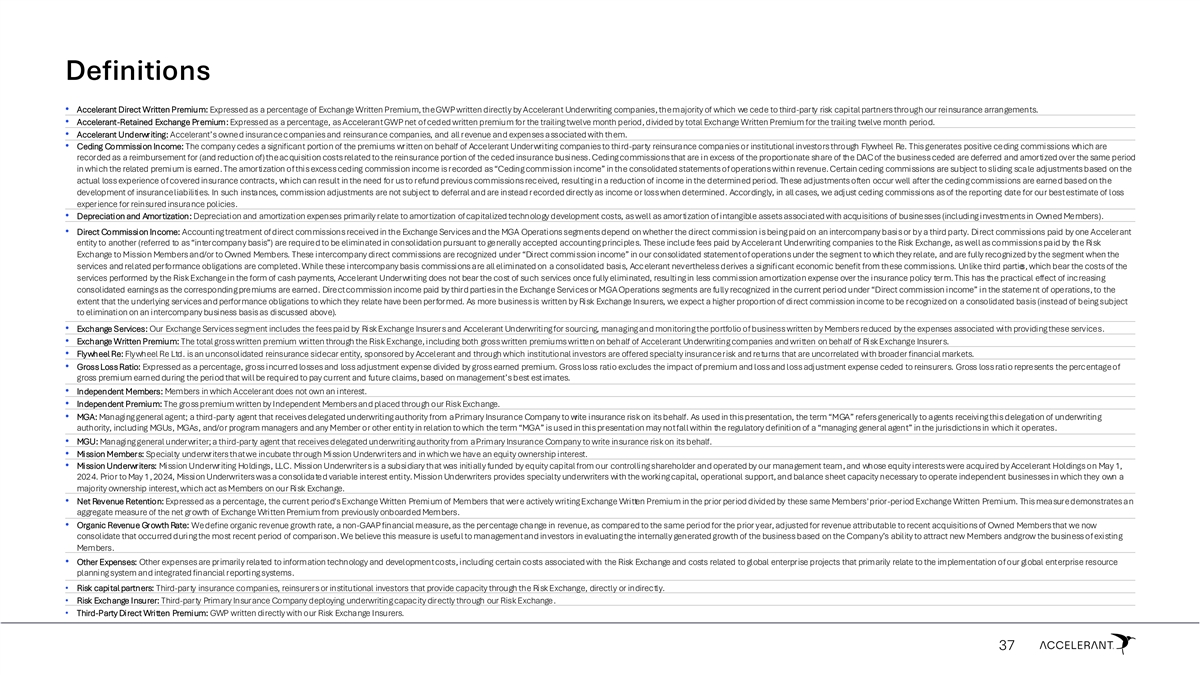 Definitions • Accelerant Direct Written Premium: Expressed as a percentage of Exchange Written Premium, the GWP written directly by Accelerant Underwriting companies, the majority of which we cede to third-party risk capital partners through our reinsurance arrangements. • Accelerant-Retained Exchange Premium: Expressed as a percentage, as Accelerant GWP net of ceded written premium for the trailing twelve month period, divided by total Exchange Written Premium for the trailing twelve month period. • Accelerant Underwriting: Accelerant’s owned insurance companies and reinsurance companies, and all revenue and expenses associated with them. • Ceding Commission Income: The company cedes a significant portion of the premiums written on behalf of Accelerant Underwriting companies to third-party reinsurance companies or institutional investors through Flywheel Re. This generates positive ceding commissions which are recorded as a reimbursement for (and reduction of) the acquisition costs related to the reinsurance portion of the ceded insurance business. Ceding commissions that are in excess of the proportionate share of the DAC of the business ceded are deferred and amortized over the same period in which the related premium is earned. The amortization of this excess ceding commission income is recorded as “Ceding commission income” in the consolidated statements of operations within revenue. Certain ceding commissions are subject to sliding scale adjustments based on the actual loss experience of covered insurance contracts, which can result in the need for us to refund previous commissions received, resulting in a reduction of income in the determined period. These adjustments often occur well after the ceding commissions are earned based on the development of insurance liabilities. In such instances, commission adjustments are not subject to deferral and are instead r ecorded directly as income or loss when determined. Accordingly, in all cases, we adjust ceding commissions as of the reporting date for our best estimate of loss experience for reinsured insurance policies. • Depreciation and Amortization: Depreciation and amortization expenses primarily relate to amortization of capitalized technology development costs, as well as amortization of intangible assets associated with acquisitions of businesses (including investments in Owned Members). • Direct Commission Income: Accounting treatment of direct commissions received in the Exchange Services and the MGA Operations segments depend on whether the direct commission is being paid on an intercompany basis or by a third party. Direct commissions paid by one Accelerant entity to another (referred to as “intercompany basis”) are required to be eliminated in consolidation pursuant to generally accepted accounting principles. These include fees paid by Accelerant Underwriting companies to the Risk Exchange, as well as commissions paid by the Risk Exchange to Mission Members and/or to Owned Members. These intercompany direct commissions are recognized under “Direct commission income” in our consolidated statement of operations under the segment to which they relate, and are fully recognized by the segment when the services and related performance obligations are completed. While these intercompany basis commissions are all eliminated on a consolidated basis, Accelerant nevertheless derives a significant economic benefit from these commissions. Unlike third partie s, which bear the costs of the services performed by the Risk Exchange in the form of cash payments, Accelerant Underwriting does not bear the cost of such services once fully eliminated, resulting in less commission amortization expense over the insurance policy term. This has the practical effect of increasing consolidated earnings as the corresponding premiums are earned. Direct commission income paid by third parties in the Exchange Services or MGA Operations segments are fully recognized in the current period under “Direct commission income” in the stateme nt of operations, to the extent that the underlying services and performance obligations to which they relate have been performed. As more business is written by Risk Exchange Insurers, we expect a higher proportion of direct commission income to be recognized on a consolidated basis (instead of being subject to elimination on an intercompany business basis as discussed above). • Exchange Services: Our Exchange Services segment includes the fees paid by Risk Exchange Insurers and Accelerant Underwriting for sourcing, managing and monitoring the portfolio of business written by Members reduced by the expenses associated with providing these services. • Exchange Written Premium: The total gross written premium written through the Risk Exchange, including both gross written premiums written on behalf of Accelerant Underwriting companies and written on behalf of Risk Exchange Insurers. • Flywheel Re: Flywheel Re Ltd. is an unconsolidated reinsurance sidecar entity, sponsored by Accelerant and through which institutional investors are offered specialty insurance risk and returns that are uncorrelated with broader financial markets. • Gross Loss Ratio: Expressed as a percentage, gross incurred losses and loss adjustment expense divided by gross earned premium. Gross loss ratio excludes the impact of premium and loss and loss adjustment expense ceded to reinsurers. Gross loss ratio represents the percentage of gross premium earned during the period that will be required to pay current and future claims, based on management’s best est imates. • Independent Members: Members in which Accelerant does not own an interest. • Independent Premium: The gross premium written by Independent Members and placed through our Risk Exchange. • MGA: Managing general agent; a third-party agent that receives delegated underwriting authority from a Primary Insurance Company to w rite insurance risk on its be