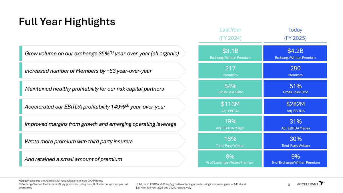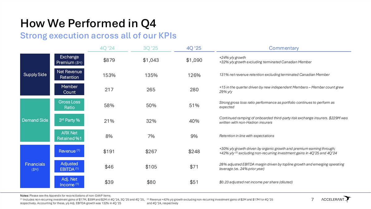 Full Year Highlights Last Year Today (FY 2024) (FY 2025) $3.1B $4.2B (1) Grew volume on our exchange 35% year-over-year (all organic) Exchange Written Premium Exchange Written Premium 217 280 Increased number of Members by +63 year-over-year Members Members 54% 51% Maintained healthy profitability for our risk capital partners Gross Loss Ratio Gross Loss Ratio $113M $282M (2) Accelerated our EBITDA profitability 149% year-over-year Adj. EBITDA Adj. EBITDA 19% 31% Improved margins from growth and emerging operating leverage Adj. EBITDA Margin Adj. EBITDA Margin 6 16% 30% Wrote more premium with third party insurers Third-Party Written Third-Party Written 8% 9% And retained a small amount of premium % of Exchange Written Premium % of Exchange Written Premium Notes: Please see the Appendix for reconciliations of non-GAAP items. (1) ( 2) Exchange Written Premium +41% y/y growth excluding run-off of Member with subpar unit Adjusted EBITDA +162% y/y growth excluding non-recurring investment gains of $41M and 6 economics $21M for full year 2025 and 2024, respectively