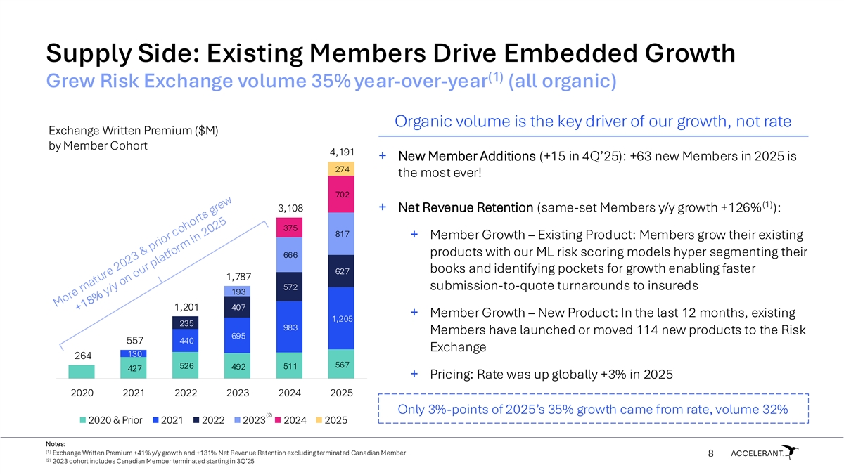 How We Performed in Q4 Strong execution across all of our KPIs 4Q ‘24 3Q ‘25 4Q ‘25 Commentary Exchange +24% y/y growth $879 $1,043 $1,090 +32% y/y growth excluding terminated Canadian Member Premium ($M) Net Revenue 131% net revenue retention excluding terminated Canadian Member Supply Side 153% 135% 126% Retention Member +15 in the quarter driven by new independent Members – Member count grew 217 265 280 29% y/y Count Gross Loss Strong gross loss ratio performance as portfolio continues to perform as 58% 50% 51% expected Ratio Continued ramping of onboarded third-party risk exchange insurers. $229M was rd 3 Party % Demand Side 21% 32% 40% written with non-Hadron insurers ARX Net Retention in line with expectations 8% 7% 9% Retained %1 +30% y/y growth driven by organic growth and premium earning through; (1) Revenue $191 $267 $248 (2) +42% y/y excluding non-recurring investment gains in 4Q’25 and 4Q’24 Adjusted Financials 28% adjusted EBITDA margin driven by topline growth and emerging operating $46 $105 $71 (1) leverage (vs. 24% prior year) ($M) EBITDA Adj. Net $0.23 adjusted net income per share (diluted) $39 $80 $51 (1) Income Notes: Please see the Appendix for reconciliations of non-GAAP items. (1) (2) Includes non-recurring investment gains of $17M, $39M and $2M in 4Q ’24, 3Q ’25 and 4Q ’25, Revenue +42% y/y growth excluding non-recurring investment gains of $2M and $17M for 4Q ‘25 7 respectively. Accounting for these, y/y Adj. EBITDA growth was 132% in 4Q ‘25 and 4Q ‘24, respectively