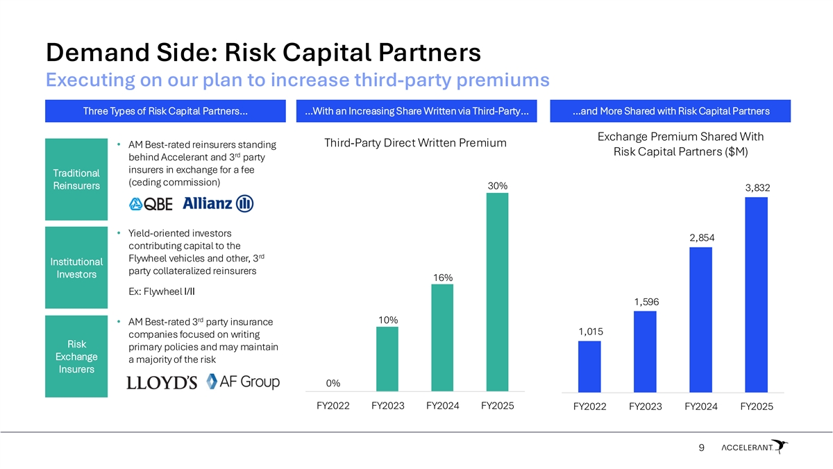 Supply Side: Existing Members Drive Embedded Growth (1) Grew Risk Exchange volume 35% year-over-year (all organic) Organic volume is the key driver of our growth, not rate Exchange Written Premium ($M) by Member Cohort 4,191 + New Member Additions (+15 in 4Q’25): +63 new Members in 2025 is 274 the most ever! 702 (1) 3,108 + Net Revenue Retention (same-set Members y/y growth +126% ): 375 817 + Member Growth – Existing Product: Members grow their existing products with our ML risk scoring models hyper segmenting their 666 books and identifying pockets for growth enabling faster 627 1,787 572 submission-to-quote turnarounds to insureds 193 1,201 407 + Member Growth – New Product: In the last 12 months, existing 1,205 235 983 Members have launched or moved 114 new products to the Risk 695 557 440 Exchange 130 264 567 526 492 511 427 + Pricing: Rate was up globally +3% in 2025 2020 2021 2022 2023 2024 2025 Only 3%-points of 2025’s 35% growth came from rate, volume 32% (2) 2020 & Prior 2021 2022 2023 2024 2025 Notes: (1) Exchange Written Premium +41% y/y growth and +131% Net Revenue Retention excluding terminated Canadian Member 8 (2) 2023 cohort includes Canadian Member terminated starting in 3Q’25