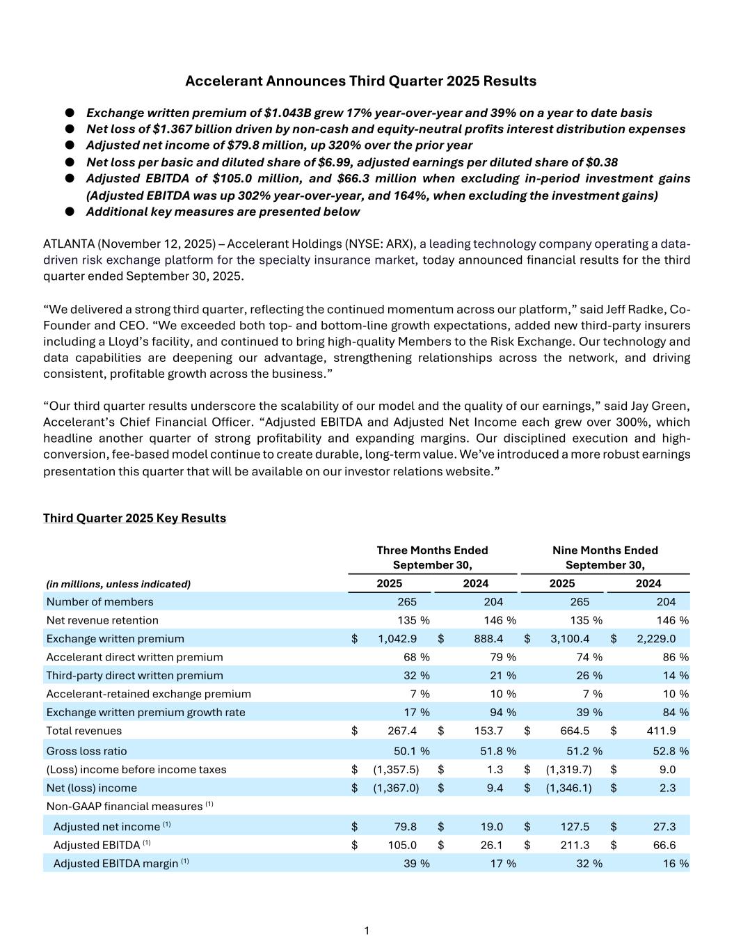 1 Accelerant Announces Third Quarter 2025 Results ● Exchange written premium of $1.043B grew 17% year-over-year and 39% on a year to date basis ● Net loss of $1.367 billion driven by non-cash and equity-neutral profits interest distribution expenses ● Adjusted net income of $79.8 million, up 320% over the prior year ● Net loss per basic and diluted share of $6.99, adjusted earnings per diluted share of $0.38 ● Adjusted EBITDA of $105.0 million, and $66.3 million when excluding in-period investment gains (Adjusted EBITDA was up 302% year-over-year, and 164%, when excluding the investment gains) ● Additional key measures are presented below ATLANTA (November 12, 2025) – Accelerant Holdings (NYSE: ARX), a leading technology company operating a data- driven risk exchange platform for the specialty insurance market, today announced financial results for the third quarter ended September 30, 2025. “We delivered a strong third quarter, reflecting the continued momentum across our platform,” said Jeff Radke, Co- Founder and CEO. “We exceeded both top- and bottom-line growth expectations, added new third-party insurers including a Lloyd’s facility, and continued to bring high-quality Members to the Risk Exchange. Our technology and data capabilities are deepening our advantage, strengthening relationships across the network, and driving consistent, profitable growth across the business.” “Our third quarter results underscore the scalability of our model and the quality of our earnings,” said Jay Green, Accelerant’s Chief Financial Officer. “Adjusted EBITDA and Adjusted Net Income each grew over 300%, which headline another quarter of strong profitability and expanding margins. Our disciplined execution and high- conversion, fee-based model continue to create durable, long-term value. We’ve introduced a more robust earnings presentation this quarter that will be available on our investor relations website.” Third Quarter 2025 Key Results Three Months Ended September 30, Nine Months Ended September 30, (in millions, unless indicated) 2025 2024 2025 2024 Number of members 265 204 265 204 Net revenue retention 135 % 146 % 135 % 146 % Exchange written premium $ 1,042.9 $ 888.4 $ 3,100.4 $ 2,229.0 Accelerant direct written premium 68 % 79 % 74 % 86 % Third-party direct written premium 32 % 21 % 26 % 14 % Accelerant-retained exchange premium 7 % 10 % 7 % 10 % Exchange written premium growth rate 17 % 94 % 39 % 84 % Total revenues $ 267.4 $ 153.7 $ 664.5 $ 411.9 Gross loss ratio 50.1 % 51.8 % 51.2 % 52.8 % (Loss) income before income taxes $ (1,357.5) $ 1.3 $ (1,319.7) $ 9.0 Net (loss) income $ (1,367.0) $ 9.4 $ (1,346.1) $ 2.3 Non-GAAP financial measures (1) Adjusted net income (1) $ 79.8 $ 19.0 $ 127.5 $ 27.3 Adjusted EBITDA (1) $ 105.0 $ 26.1 $ 211.3 $ 66.6 Adjusted EBITDA margin (1) 39 % 17 % 32 % 16 %