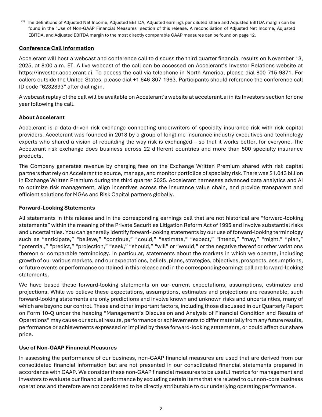 2 (1) The definitions of Adjusted Net Income, Adjusted EBITDA, Adjusted earnings per diluted share and Adjusted EBITDA margin can be found in the "Use of Non-GAAP Financial Measures" section of this release. A reconciliation of Adjusted Net Income, Adjusted EBITDA, and Adjusted EBITDA margin to the most directly comparable GAAP measures can be found on page 12. Conference Call Information Accelerant will host a webcast and conference call to discuss the third quarter financial results on November 13, 2025, at 8:00 a.m. ET. A live webcast of the call can be accessed on Accelerant’s Investor Relations website at https://investor.accelerant.ai. To access the call via telephone in North America, please dial 800-715-9871. For callers outside the United States, please dial +1 646-307-1963. Participants should reference the conference call ID code “6232893” after dialing in. A webcast replay of the call will be available on Accelerant's website at accelerant.ai in its Investors section for one year following the call. About Accelerant Accelerant is a data-driven risk exchange connecting underwriters of specialty insurance risk with risk capital providers. Accelerant was founded in 2018 by a group of longtime insurance industry executives and technology experts who shared a vision of rebuilding the way risk is exchanged – so that it works better, for everyone. The Accelerant risk exchange does business across 22 different countries and more than 500 specialty insurance products. The Company generates revenue by charging fees on the Exchange Written Premium shared with risk capital partners that rely on Accelerant to source, manage, and monitor portfolios of specialty risk. There was $1.043 billion in Exchange Written Premium during the third quarter 2025. Accelerant harnesses advanced data analytics and AI to optimize risk management, align incentives across the insurance value chain, and provide transparent and efficient solutions for MGAs and Risk Capital partners globally. Forward-Looking Statements All statements in this release and in the corresponding earnings call that are not historical are “forward-looking statements” within the meaning of the Private Securities Litigation Reform Act of 1995 and involve substantial risks and uncertainties. You can generally identify forward-looking statements by our use of forward-looking terminology such as “anticipate,” “believe,” “continue,” “could,” “estimate,” “expect,” “intend,” “may,” “might,” “plan,” “potential,” “predict,” “projection,” “seek,” “should,” “will” or “would,” or the negative thereof or other variations thereon or comparable terminology. In particular, statements about the markets in which we operate, including growth of our various markets, and our expectations, beliefs, plans, strategies, objectives, prospects, assumptions, or future events or performance contained in this release and in the corresponding earnings call are forward-looking statements. We have based these forward-looking statements on our current expectations, assumptions, estimates and projections. While we believe these expectations, assumptions, estimates and projections are reasonable, such forward-looking statements are only predictions and involve known and unknown risks and uncertainties, many of which are beyond our control. These and other important factors, including those discussed in our Quarterly Report on Form 10-Q under the heading “Management’s Discussion and Analysis of Financial Condition and Results of Operations” may cause our actual results, performance or achievements to differ materially from any future results, performance or achievements expressed or implied by these forward-looking statements, or could affect our share price. Use of Non-GAAP Financial Measures In assessing the performance of our business, non-GAAP financial measures are used that are derived from our consolidated financial information but are not presented in our consolidated financial statements prepared in accordance with GAAP. We consider these non-GAAP financial measures to be useful metrics for management and investors to evaluate our financial performance by excluding certain items that are related to our non-core business operations and therefore are not considered to be directly attributable to our underlying operating performance.