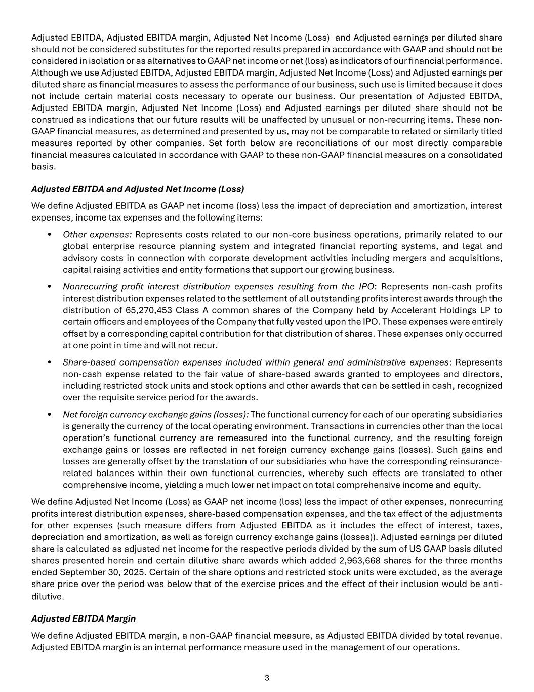 3 Adjusted EBITDA, Adjusted EBITDA margin, Adjusted Net Income (Loss) and Adjusted earnings per diluted share should not be considered substitutes for the reported results prepared in accordance with GAAP and should not be considered in isolation or as alternatives to GAAP net income or net (loss) as indicators of our financial performance. Although we use Adjusted EBITDA, Adjusted EBITDA margin, Adjusted Net Income (Loss) and Adjusted earnings per diluted share as financial measures to assess the performance of our business, such use is limited because it does not include certain material costs necessary to operate our business. Our presentation of Adjusted EBITDA, Adjusted EBITDA margin, Adjusted Net Income (Loss) and Adjusted earnings per diluted share should not be construed as indications that our future results will be unaffected by unusual or non-recurring items. These non- GAAP financial measures, as determined and presented by us, may not be comparable to related or similarly titled measures reported by other companies. Set forth below are reconciliations of our most directly comparable financial measures calculated in accordance with GAAP to these non-GAAP financial measures on a consolidated basis. Adjusted EBITDA and Adjusted Net Income (Loss) We define Adjusted EBITDA as GAAP net income (loss) less the impact of depreciation and amortization, interest expenses, income tax expenses and the following items: • Other expenses: Represents costs related to our non-core business operations, primarily related to our global enterprise resource planning system and integrated financial reporting systems, and legal and advisory costs in connection with corporate development activities including mergers and acquisitions, capital raising activities and entity formations that support our growing business. • Nonrecurring profit interest distribution expenses resulting from the IPO: Represents non-cash profits interest distribution expenses related to the settlement of all outstanding profits interest awards through the distribution of 65,270,453 Class A common shares of the Company held by Accelerant Holdings LP to certain officers and employees of the Company that fully vested upon the IPO. These expenses were entirely offset by a corresponding capital contribution for that distribution of shares. These expenses only occurred at one point in time and will not recur. • Share-based compensation expenses included within general and administrative expenses: Represents non-cash expense related to the fair value of share-based awards granted to employees and directors, including restricted stock units and stock options and other awards that can be settled in cash, recognized over the requisite service period for the awards. • Net foreign currency exchange gains (losses): The functional currency for each of our operating subsidiaries is generally the currency of the local operating environment. Transactions in currencies other than the local operation’s functional currency are remeasured into the functional currency, and the resulting foreign exchange gains or losses are reflected in net foreign currency exchange gains (losses). Such gains and losses are generally offset by the translation of our subsidiaries who have the corresponding reinsurance- related balances within their own functional currencies, whereby such effects are translated to other comprehensive income, yielding a much lower net impact on total comprehensive income and equity. We define Adjusted Net Income (Loss) as GAAP net income (loss) less the impact of other expenses, nonrecurring profits interest distribution expenses, share-based compensation expenses, and the tax effect of the adjustments for other expenses (such measure differs from Adjusted EBITDA as it includes the effect of interest, taxes, depreciation and amortization, as well as foreign currency exchange gains (losses)). Adjusted earnings per diluted share is calculated as adjusted net income for the respective periods divided by the sum of US GAAP basis diluted shares presented herein and certain dilutive share awards which added 2,963,668 shares for the three months ended September 30, 2025. Certain of the share options and restricted stock units were excluded, as the average share price over the period was below that of the exercise prices and the effect of their inclusion would be anti- dilutive. Adjusted EBITDA Margin We define Adjusted EBITDA margin, a non-GAAP financial measure, as Adjusted EBITDA divided by total revenue. Adjusted EBITDA margin is an internal performance measure used in the management of our operations.