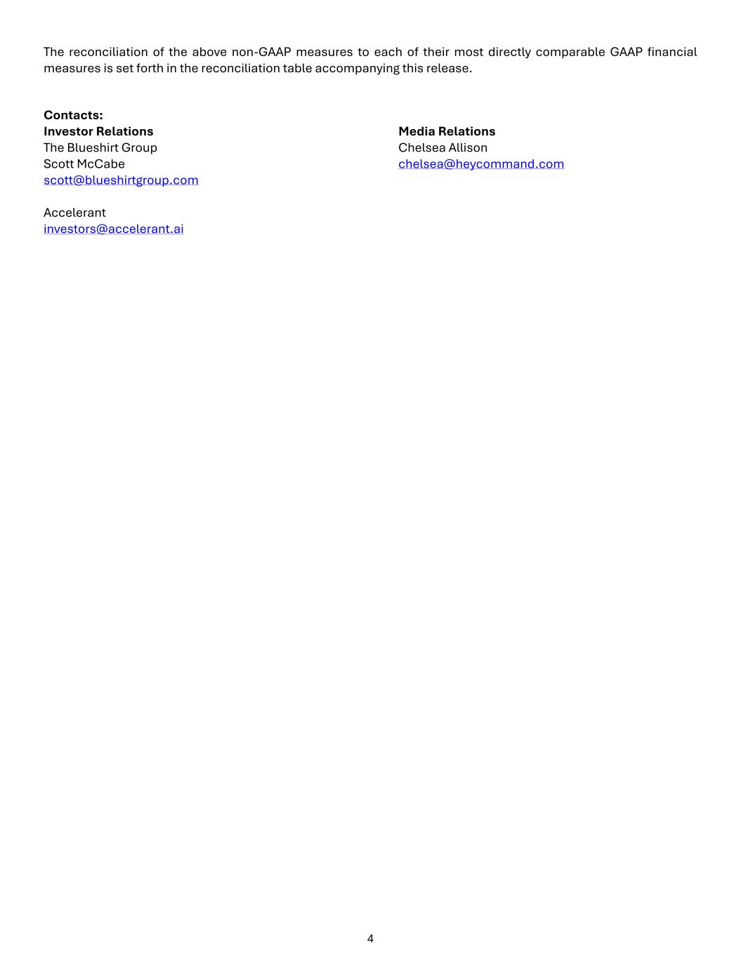 4 The reconciliation of the above non-GAAP measures to each of their most directly comparable GAAP financial measures is set forth in the reconciliation table accompanying this release. Contacts: Investor Relations Media Relations The Blueshirt Group Chelsea Allison Scott McCabe chelsea@heycommand.com scott@blueshirtgroup.com Accelerant investors@accelerant.ai