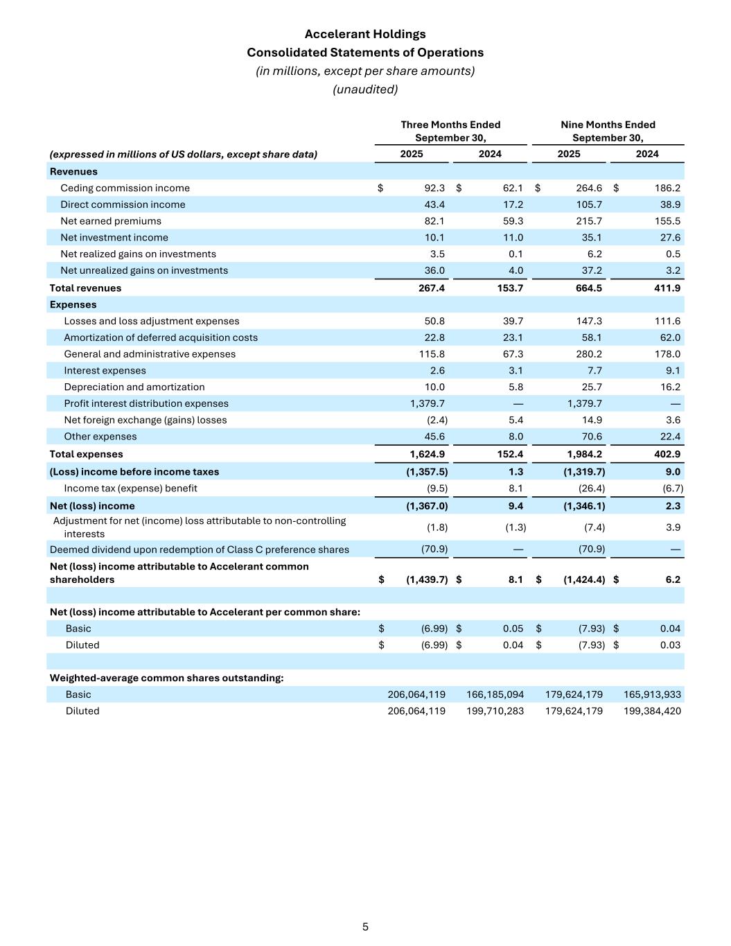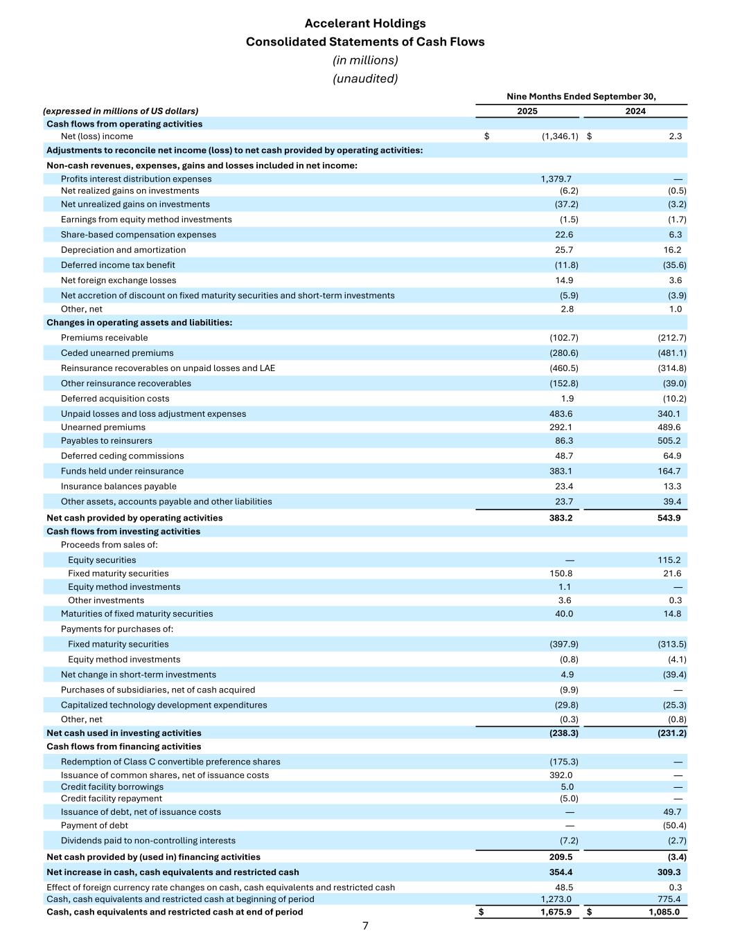 7 Accelerant Holdings Consolidated Statements of Cash Flows (in millions) (unaudited) Nine Months Ended September 30, (expressed in millions of US dollars) 2025 2024 Cash flows from operating activities Net (loss) income $ (1,346.1) $ 2.3 Adjustments to reconcile net income (loss) to net cash provided by operating activities: Non-cash revenues, expenses, gains and losses included in net income: Profits interest distribution expenses 1,379.7 — Net realized gains on investments (6.2) (0.5) Net unrealized gains on investments (37.2) (3.2) Earnings from equity method investments (1.5) (1.7) Share-based compensation expenses 22.6 6.3 Depreciation and amortization 25.7 16.2 Deferred income tax benefit (11.8) (35.6) Net foreign exchange losses 14.9 3.6 Net accretion of discount on fixed maturity securities and short-term investments (5.9) (3.9) Other, net 2.8 1.0 Changes in operating assets and liabilities: Premiums receivable (102.7) (212.7) Ceded unearned premiums (280.6) (481.1) Reinsurance recoverables on unpaid losses and LAE (460.5) (314.8) Other reinsurance recoverables (152.8) (39.0) Deferred acquisition costs 1.9 (10.2) Unpaid losses and loss adjustment expenses 483.6 340.1 Unearned premiums 292.1 489.6 Payables to reinsurers 86.3 505.2 Deferred ceding commissions 48.7 64.9 Funds held under reinsurance 383.1 164.7 Insurance balances payable 23.4 13.3 Other assets, accounts payable and other liabilities 23.7 39.4 Net cash provided by operating activities 383.2 543.9 Cash flows from investing activities Proceeds from sales of: Equity securities — 115.2 Fixed maturity securities 150.8 21.6 Equity method investments 1.1 — Other investments 3.6 0.3 Maturities of fixed maturity securities 40.0 14.8 Payments for purchases of: Fixed maturity securities (397.9) (313.5) Equity method investments (0.8) (4.1) Net change in short-term investments 4.9 (39.4) Purchases of subsidiaries, net of cash acquired (9.9) — Capitalized technology development expenditures (29.8) (25.3) Other, net (0.3) (0.8) Net cash used in investing activities (238.3) (231.2) Cash flows from financing activities Redemption of Class C convertible preference shares (175.3) — Issuance of common shares, net of issuance costs 392.0 — Credit facility borrowings 5.0 — Credit facility repayment (5.0) — Issuance of debt, net of issuance costs — 49.7 Payment of debt — (50.4) Dividends paid to non-controlling interests (7.2) (2.7) Net cash provided by (used in) financing activities 209.5 (3.4) Net increase in cash, cash equivalents and restricted cash 354.4 309.3 Effect of foreign currency rate changes on cash, cash equivalents and restricted cash 48.5 0.3 Cash, cash equivalents and restricted cash at beginning of period 1,273.0 775.4 Cash, cash equivalents and restricted cash at end of period $ 1,675.9 $ 1,085.0