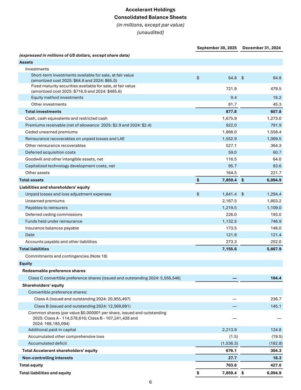 6 Accelerant Holdings Consolidated Balance Sheets (in millions, except par value) (unaudited) September 30, 2025 December 31, 2024 (expressed in millions of US dollars, except share data) Assets Investments Short-term investments available for sale, at fair value (amortized cost 2025: $64.8 and 2024: $65.0) $ 64.8 $ 64.8 Fixed maturity securities available for sale, at fair value (amortized cost 2025: $716.9 and 2024: $485.6) 721.9 479.5 Equity method investments 9.4 18.2 Other investments 81.7 45.3 Total investments 877.8 607.8 Cash, cash equivalents and restricted cash 1,675.9 1,273.0 Premiums receivable (net of allowance 2025: $2.9 and 2024: $2.4) 922.0 791.9 Ceded unearned premiums 1,868.0 1,558.4 Reinsurance recoverables on unpaid losses and LAE 1,552.9 1,069.5 Other reinsurance recoverables 527.1 364.3 Deferred acquisition costs 59.0 60.7 Goodwill and other intangible assets, net 116.5 64.0 Capitalized technology development costs, net 95.7 83.6 Other assets 164.5 221.7 Total assets $ 7,859.4 $ 6,094.9 Liabilities and shareholders' equity Unpaid losses and loss adjustment expenses $ 1,841.4 $ 1,294.4 Unearned premiums 2,167.5 1,803.2 Payables to reinsurers 1,219.5 1,109.0 Deferred ceding commissions 226.0 193.0 Funds held under reinsurance 1,132.5 746.9 Insurance balances payable 173.5 148.0 Debt 121.9 121.4 Accounts payable and other liabilities 273.3 252.0 Total liabilities 7,155.6 5,667.9 Commitments and contingencies (Note 18) Equity Redeemable preference shares Class C convertible preference shares (issued and outstanding 2024: 5,556,546) — 104.4 Shareholders' equity Convertible preference shares: Class A (issued and outstanding 2024: 20,955,497) — 236.7 Class B (issued and outstanding 2024: 12,569,691) — 145.1 Common shares (par value $0.000001 per share, issued and outstanding 2025: Class A - 114,578,616; Class B - 107,241,428 and 2024: 166,185,094) — — Additional paid-in capital 2,213.9 124.8 Accumulated other comprehensive loss (1.5) (19.5) Accumulated deficit (1,536.3) (182.8) Total Accelerant shareholders' equity 676.1 304.3 Non-controlling interests 27.7 18.3 Total equity 703.8 427.0 Total liabilities and equity $ 7,859.4 $ 6,094.9
