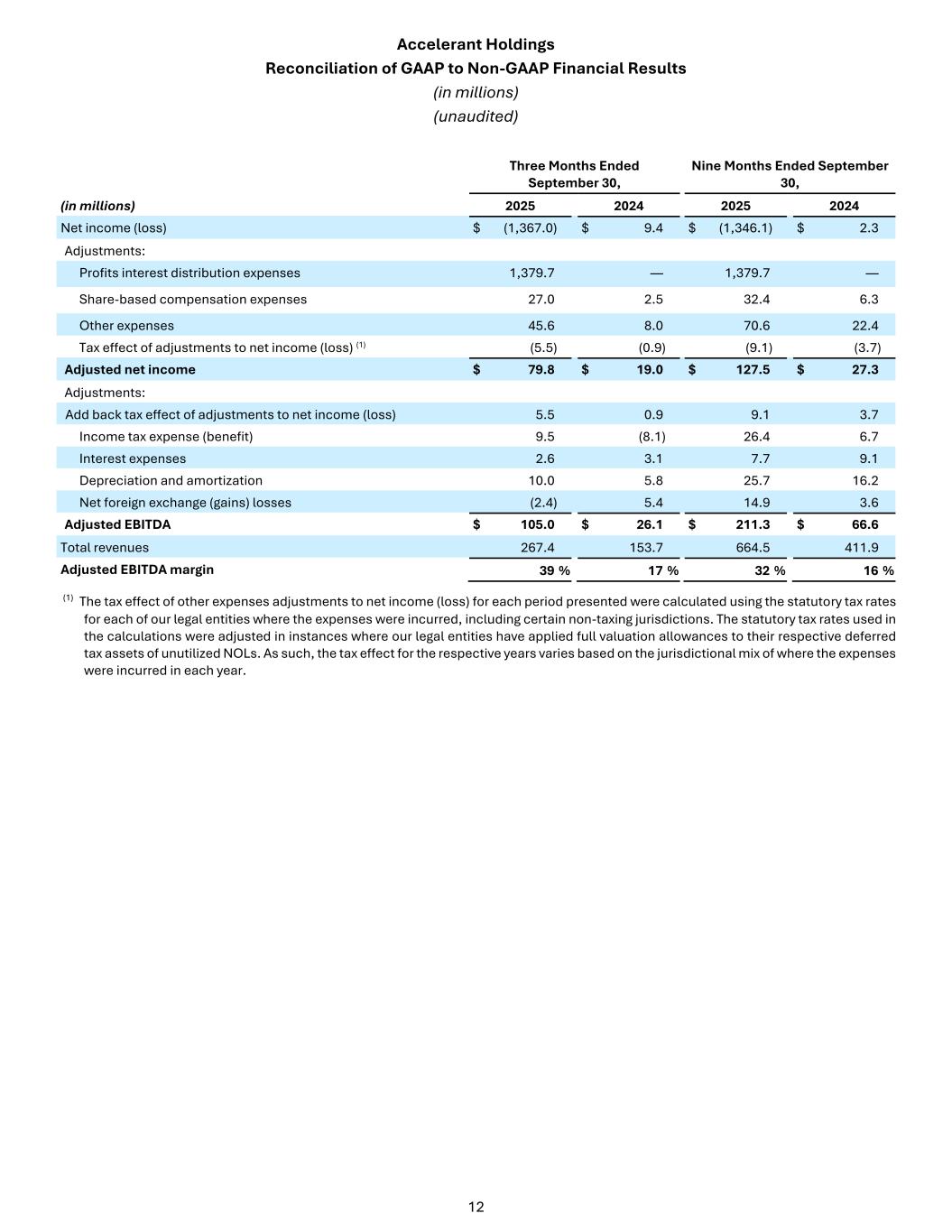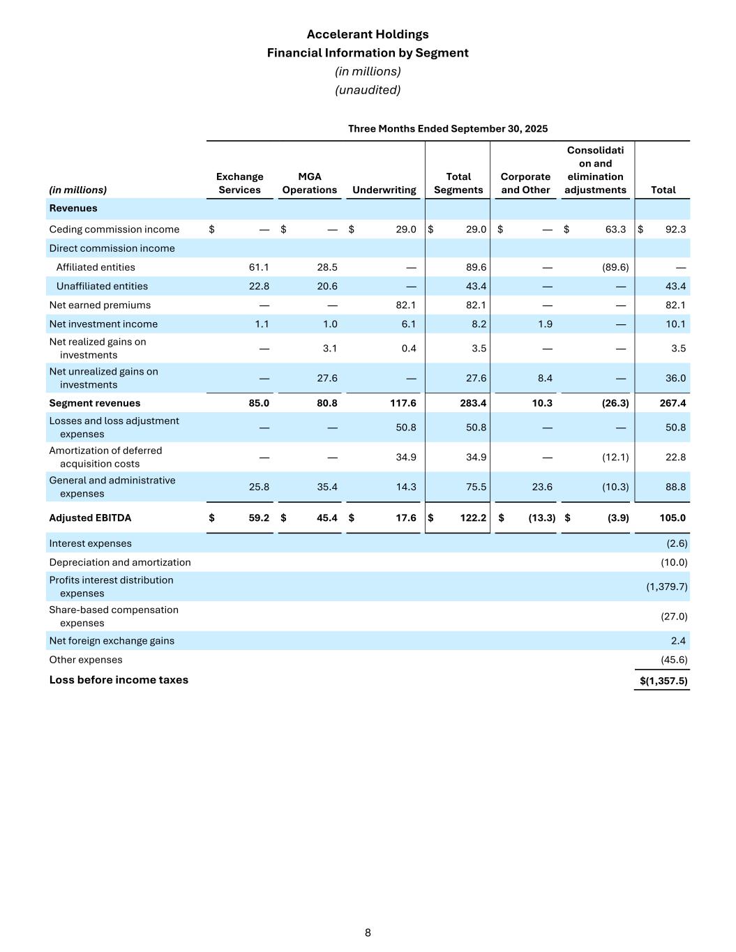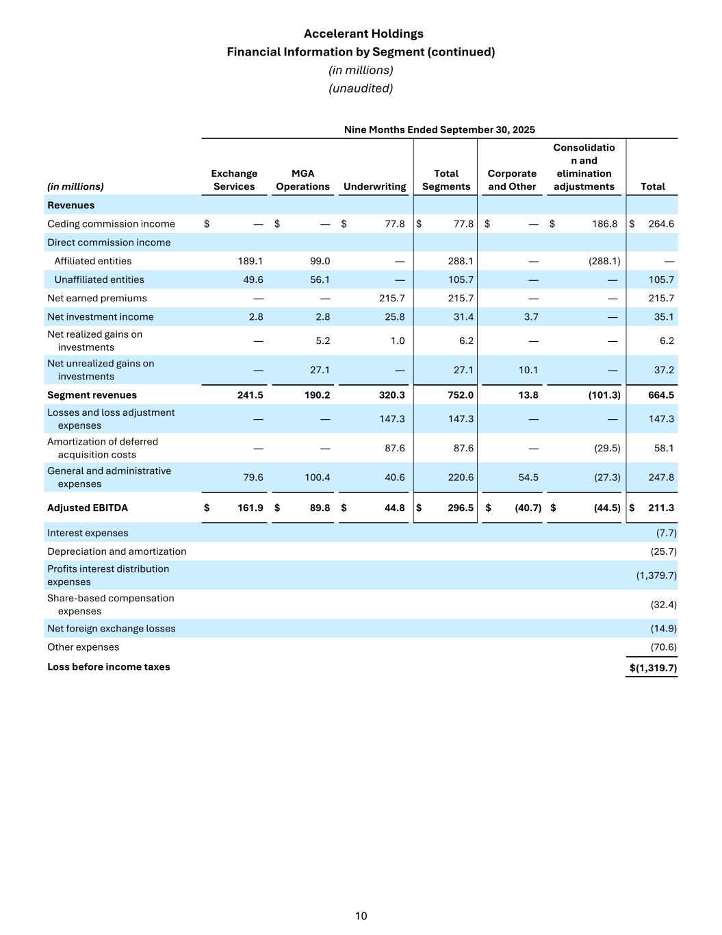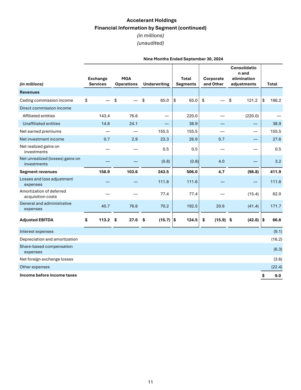 10 Accelerant Holdings Financial Information by Segment (continued) (in millions) (unaudited) Nine Months Ended September 30, 2025 (in millions) Exchange Services MGA Operations Underwriting Total Segments Corporate and Other Consolidatio n and elimination adjustments Total Revenues Ceding commission income $ — $ — $ 77.8 $ 77.8 $ — $ 186.8 $ 264.6 Direct commission income Affiliated entities 189.1 99.0 — 288.1 — (288.1) — Unaffiliated entities 49.6 56.1 — 105.7 — — 105.7 Net earned premiums — — 215.7 215.7 — — 215.7 Net investment income 2.8 2.8 25.8 31.4 3.7 — 35.1 Net realized gains on investments — 5.2 1.0 6.2 — — 6.2 Net unrealized gains on investments — 27.1 — 27.1 10.1 — 37.2 Segment revenues 241.5 190.2 320.3 752.0 13.8 (101.3) 664.5 Losses and loss adjustment expenses — — 147.3 147.3 — — 147.3 Amortization of deferred acquisition costs — — 87.6 87.6 — (29.5) 58.1 General and administrative expenses 79.6 100.4 40.6 220.6 54.5 (27.3) 247.8 Adjusted EBITDA $ 161.9 $ 89.8 $ 44.8 $ 296.5 $ (40.7) $ (44.5) $ 211.3 Interest expenses (7.7) Depreciation and amortization (25.7) Profits interest distribution expenses (1,379.7) Share-based compensation expenses (32.4) Net foreign exchange losses (14.9) Other expenses (70.6) Loss before income taxes $ (1,319.7)
