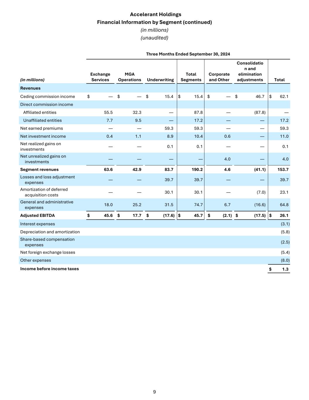 8 Accelerant Holdings Financial Information by Segment (in millions) (unaudited) Three Months Ended September 30, 2025 (in millions) Exchange Services MGA Operations Underwriting Total Segments Corporate and Other Consolidati on and elimination adjustments Total Revenues Ceding commission income $ — $ — $ 29.0 $ 29.0 $ — $ 63.3 $ 92.3 Direct commission income Affiliated entities 61.1 28.5 — 89.6 — (89.6) — Unaffiliated entities 22.8 20.6 — 43.4 — — 43.4 Net earned premiums — — 82.1 82.1 — — 82.1 Net investment income 1.1 1.0 6.1 8.2 1.9 — 10.1 Net realized gains on investments — 3.1 0.4 3.5 — — 3.5 Net unrealized gains on investments — 27.6 — 27.6 8.4 — 36.0 Segment revenues 85.0 80.8 117.6 283.4 10.3 (26.3) 267.4 Losses and loss adjustment expenses — — 50.8 50.8 — — 50.8 Amortization of deferred acquisition costs — — 34.9 34.9 — (12.1) 22.8 General and administrative expenses 25.8 35.4 14.3 75.5 23.6 (10.3) 88.8 Adjusted EBITDA $ 59.2 $ 45.4 $ 17.6 $ 122.2 $ (13.3) $ (3.9) 105.0 Interest expenses (2.6) Depreciation and amortization (10.0) Profits interest distribution expenses (1,379.7) Share-based compensation expenses (27.0) Net foreign exchange gains 2.4 Other expenses (45.6) Loss before income taxes $(1,357.5)