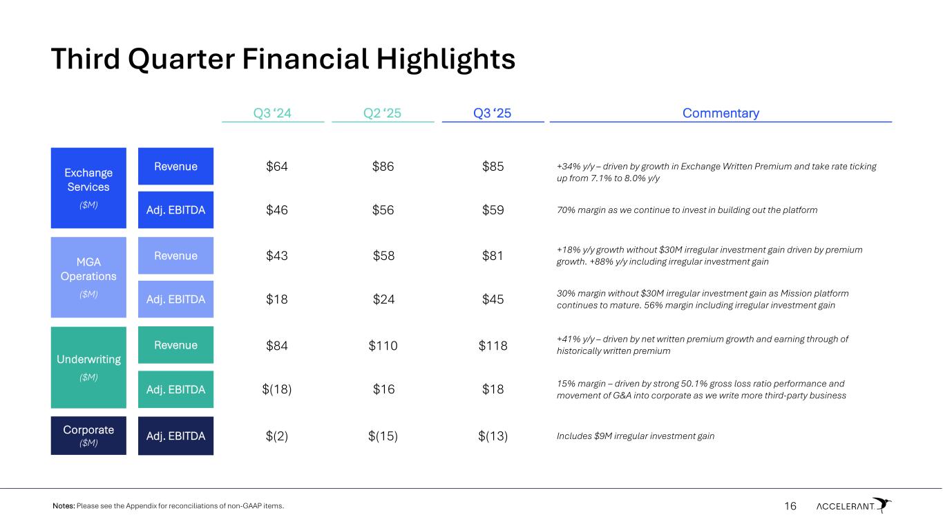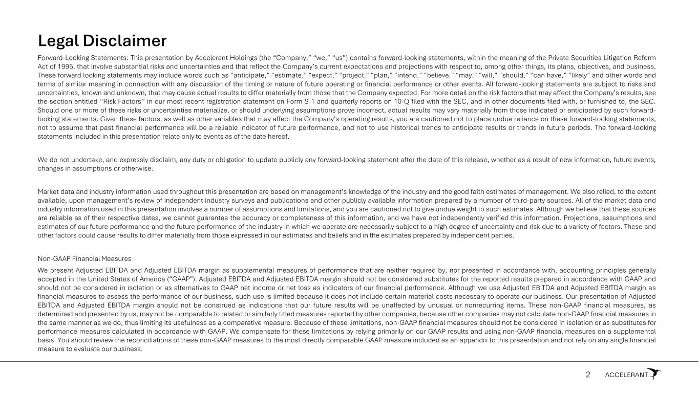 2 Legal Disclaimer Forward-Looking Statements: This presentation by Accelerant Holdings (the “Company,” “we,” “us”) contains forward-looking statements, within the meaning of the Private Securities Litigation Reform Act of 1995, that involve substantial risks and uncertainties and that reflect the Company’s current expectations and projections with respect to, among other things, its plans, objectives, and business. These forward looking statements may include words such as “anticipate,” “estimate,” “expect,” “project,” “plan,” “intend,” “believe,” “may,” “will,” “should,” “can have,” “likely” and other words and terms of similar meaning in connection with any discussion of the timing or nature of future operating or financial performance or other events. All forward-looking statements are subject to risks and uncertainties, known and unknown, that may cause actual results to differ materially from those that the Company expected. For more detail on the risk factors that may affect the Company’s results, see the section entitled ‘‘Risk Factors’’ in our most recent registration statement on Form S-1 and quarterly reports on 10-Q filed with the SEC, and in other documents filed with, or furnished to, the SEC. Should one or more of these risks or uncertainties materialize, or should underlying assumptions prove incorrect, actual results may vary materially from those indicated or anticipated by such forward- looking statements. Given these factors, as well as other variables that may affect the Company’s operating results, you are cautioned not to place undue reliance on these forward-looking statements, not to assume that past financial performance will be a reliable indicator of future performance, and not to use historical trends to anticipate results or trends in future periods. The forward-looking statements included in this presentation relate only to events as of the date hereof. We do not undertake, and expressly disclaim, any duty or obligation to update publicly any forward-looking statement after the date of this release, whether as a result of new information, future events, changes in assumptions or otherwise. Market data and industry information used throughout this presentation are based on management’s knowledge of the industry and the good faith estimates of management. We also relied, to the extent available, upon management’s review of independent industry surveys and publications and other publicly available information prepared by a number of third-party sources. All of the market data and industry information used in this presentation involves a number of assumptions and limitations, and you are cautioned not to give undue weight to such estimates. Although we believe that these sources are reliable as of their respective dates, we cannot guarantee the accuracy or completeness of this information, and we have not independently verified this information. Projections, assumptions and estimates of our future performance and the future performance of the industry in which we operate are necessarily subject to a high degree of uncertainty and risk due to a variety of factors. These and other factors could cause results to differ materially from those expressed in our estimates and beliefs and in the estimates prepared by independent parties. Non-GAAP Financial Measures We present Adjusted EBITDA and Adjusted EBITDA margin as supplemental measures of performance that are neither required by, nor presented in accordance with, accounting principles generally accepted in the United States of America (“GAAP”). Adjusted EBITDA and Adjusted EBITDA margin should not be considered substitutes for the reported results prepared in accordance with GAAP and should not be considered in isolation or as alternatives to GAAP net income or net loss as indicators of our financial performance. Although we use Adjusted EBITDA and Adjusted EBITDA margin as financial measures to assess the performance of our business, such use is limited because it does not include certain material costs necessary to operate our business. Our presentation of Adjusted EBITDA and Adjusted EBITDA margin should not be construed as indications that our future results will be unaffected by unusual or nonrecurring items. These non-GAAP financial measures, as determined and presented by us, may not be comparable to related or similarly titled measures reported by other companies, because other companies may not calculate non-GAAP financial measures in the same manner as we do, thus limiting its usefulness as a comparative measure. Because of these limitations, non-GAAP financial measures should not be considered in isolation or as substitutes for performance measures calculated in accordance with GAAP. We compensate for these limitations by relying primarily on our GAAP results and using non-GAAP financial measures on a supplemental basis. You should review the reconciliations of these non-GAAP measures to the most directly comparable GAAP measure included as an appendix to this presentation and not rely on any single financial measure to evaluate our business.