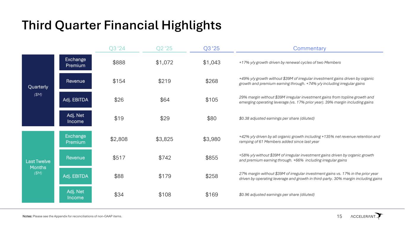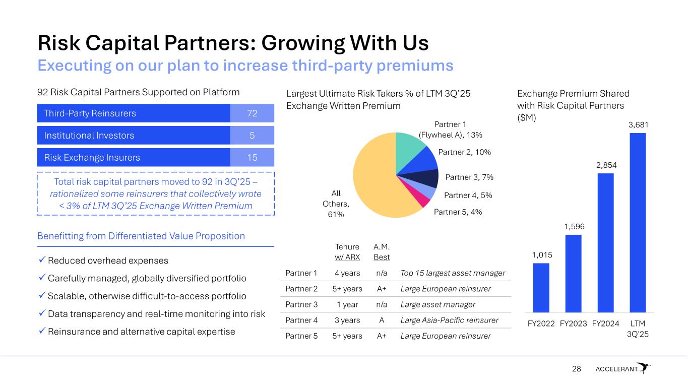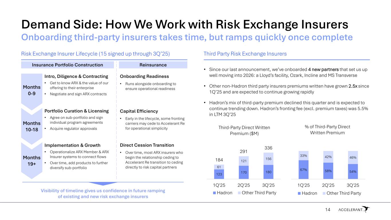Third Party Risk Exchange InsurersRisk Exchange Insurer Lifecycle (15 signed up through 3Q’25) Demand Side: How We Work with Risk Exchange Insurers Onboarding third-party insurers takes time, but ramps quickly once complete 14 Visibility of timeline gives us confidence in future ramping of existing and new risk exchange insurers Intro, Diligence & Contracting • Get to know ARX & the value of our offering to their enterprise • Negotiate and sign ARX contracts 123 170 180 61 121 156184 291 336 1Q'25 2Q'25 3Q'25 Third-Party Direct Written Premium ($M) Hadron Other Third Party 67% 58% 54% 33% 42% 46% 1Q'25 2Q'25 3Q'25 % of Third-Party Direct Written Premium Hadron Other Third Party • Since our last announcement, we’ve onboarded 4 new partners that set us up well moving into 2026: a Lloyd’s facility, Ozark, Incline and MS Transverse • Other non-Hadron third party insurers premiums written have grown 2.5x since 1Q’25 and are expected to continue growing rapidly • Hadron’s mix of third-party premium declined this quarter and is expected to continue trending down. Hadron’s fronting fee (excl. premium taxes) was 5.5% in LTM 3Q’25 Portfolio Curation & Licensing • Agree on sub-portfolio and sign individual program agreements • Acquire regulator approvals Insurance Portfolio Construction Reinsurance Implementation & Growth • Operationalize ARX Member & ARX Insurer systems to connect flows • Over time, add products to further diversify sub-portfolio Onboarding Readiness • Runs alongside onboarding to ensure operational readiness Capital Efficiency • Early in the lifecycle, some fronting carriers may cede to Accelerant Re for operational simplicity Direct Cession Transition • Over time, most ARX insurers who begin the relationship ceding to Accelerant Re transition to ceding directly to risk capital partners Months 0-9 Months 19+ Months 10-18