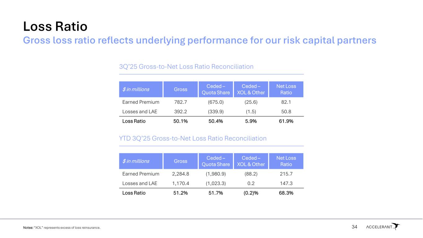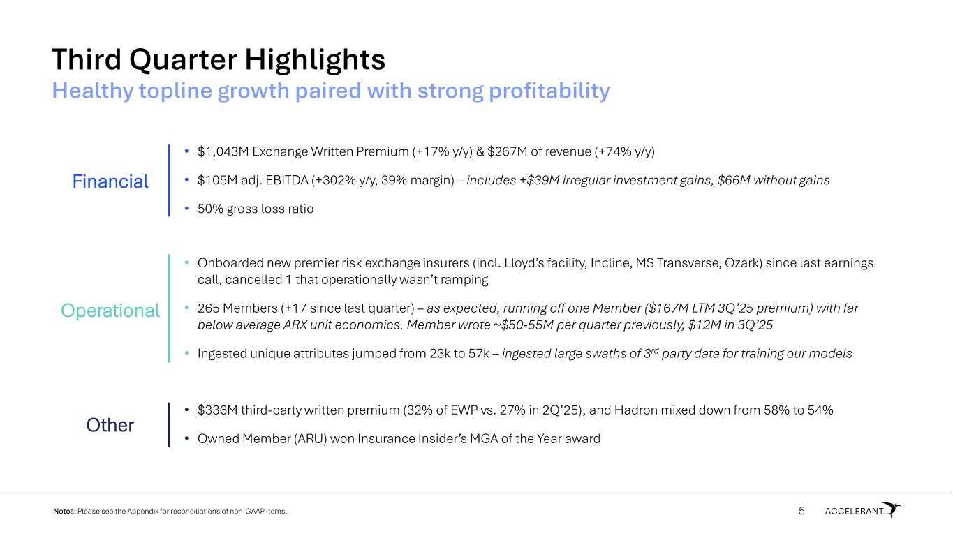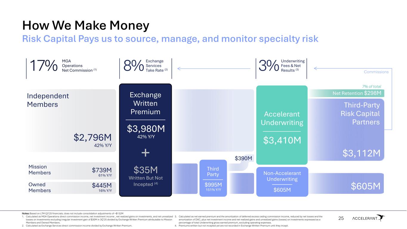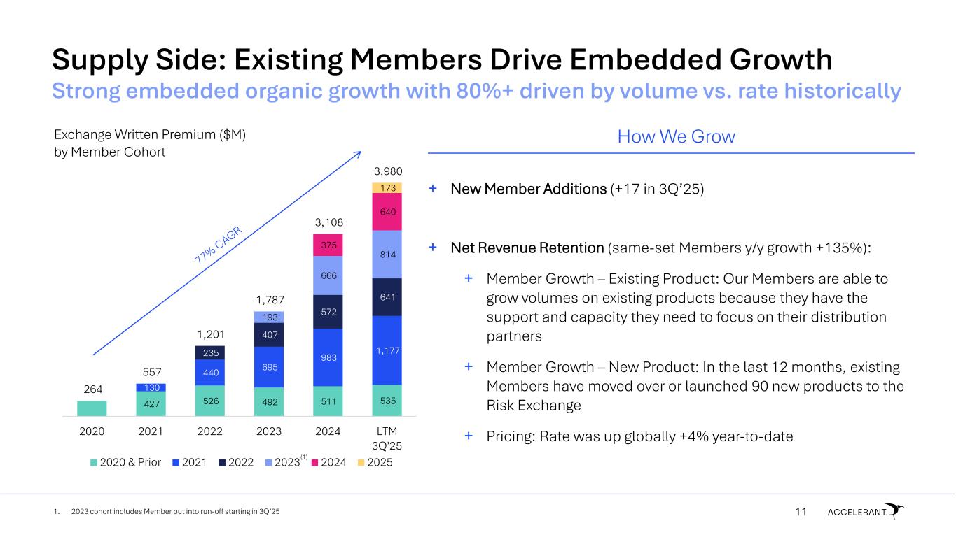 Third Party Risk Exchange InsurersRisk Exchange Insurer Lifecycle (15 signed up through 3Q’25) Demand Side: How We Work with Risk Exchange Insurers Onboarding third-party insurers takes time, but ramps quickly once complete 14 Visibility of timeline gives us confidence in future ramping of existing and new risk exchange insurers Intro, Diligence & Contracting • Get to know ARX & the value of our offering to their enterprise • Negotiate and sign ARX contracts 123 170 180 61 121 156184 291 336 1Q'25 2Q'25 3Q'25 Third-Party Direct Written Premium ($M) Hadron Other Third Party 67% 58% 54% 33% 42% 46% 1Q'25 2Q'25 3Q'25 % of Third-Party Direct Written Premium Hadron Other Third Party • Since our last announcement, we’ve onboarded 4 new partners that set us up well moving into 2026: a Lloyd’s facility, Ozark, Incline and MS Transverse • Other non-Hadron third party insurers premiums written have grown 2.5x since 1Q’25 and are expected to continue growing rapidly • Hadron’s mix of third-party premium declined this quarter and is expected to continue trending down. Hadron’s fronting fee (excl. premium taxes) was 5.5% in LTM 3Q’25 Portfolio Curation & Licensing • Agree on sub-portfolio and sign individual program agreements • Acquire regulator approvals Insurance Portfolio Construction Reinsurance Implementation & Growth • Operationalize ARX Member & ARX Insurer systems to connect flows • Over time, add products to further diversify sub-portfolio Onboarding Readiness • Runs alongside onboarding to ensure operational readiness Capital Efficiency • Early in the lifecycle, some fronting carriers may cede to Accelerant Re for operational simplicity Direct Cession Transition • Over time, most ARX insurers who begin the relationship ceding to Accelerant Re transition to ceding directly to risk capital partners Months 0-9 Months 19+ Months 10-18