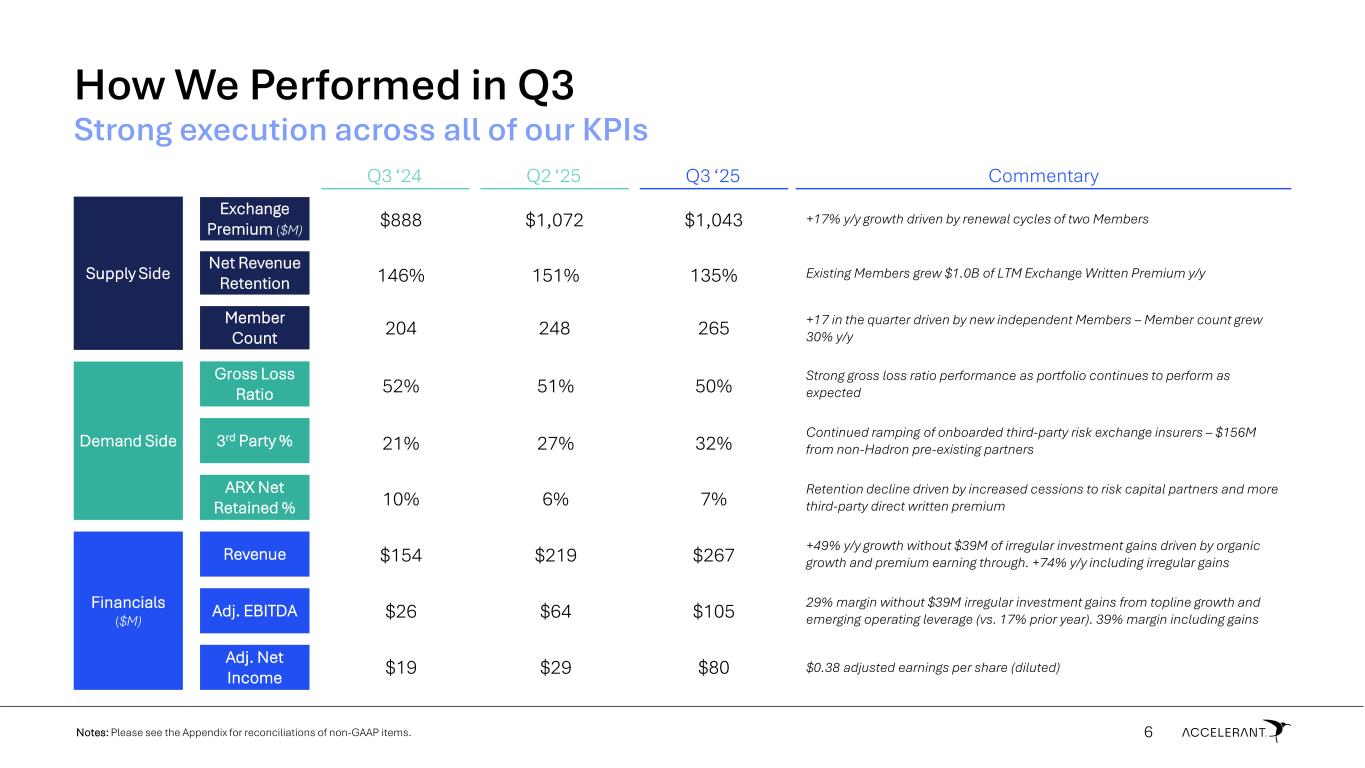 5 Third Quarter Highlights Healthy topline growth paired with strong profitability • $1,043M Exchange Written Premium (+17% y/y) & $267M of revenue (+74% y/y) • $105M adj. EBITDA (+302% y/y, 39% margin) – includes +$39M irregular investment gains, $66M without gains • 50% gross loss ratio Financial Operational • Onboarded new premier risk exchange insurers (incl. Lloyd’s facility, Incline, MS Transverse, Ozark) since last earnings call, cancelled 1 that operationally wasn’t ramping • 265 Members (+17 since last quarter) – as expected, running off one Member ($167M LTM 3Q’25 premium) with far below average ARX unit economics. Member wrote ~$50-55M per quarter previously, $12M in 3Q’25 • Ingested unique attributes jumped from 23k to 57k – ingested large swaths of 3rd party data for training our models Other • $336M third-party written premium (32% of EWP vs. 27% in 2Q’25), and Hadron mixed down from 58% to 54% • Owned Member (ARU) won Insurance Insider’s MGA of the Year award Notes: Please see the Appendix for reconciliations of non-GAAP items.