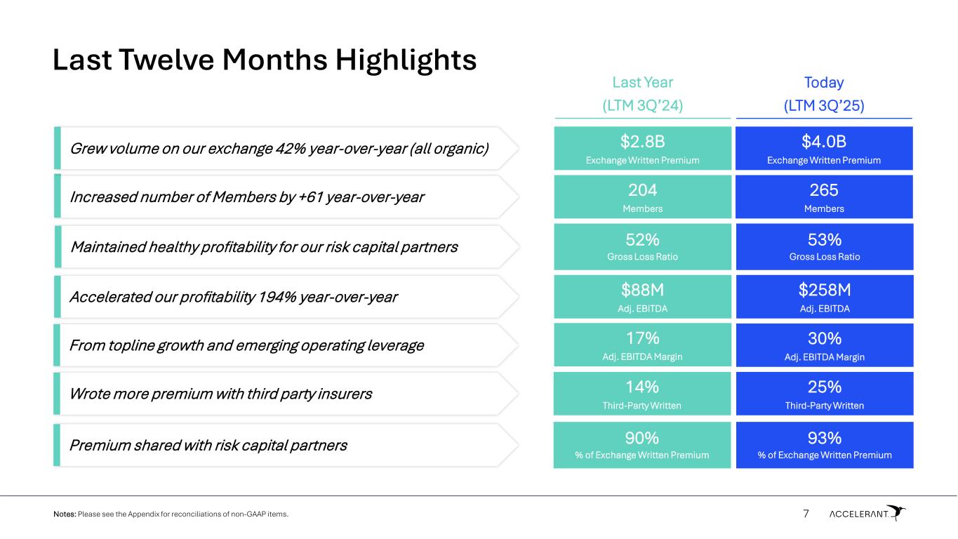 6 How We Performed in Q3 Strong execution across all of our KPIs Supply Side Demand Side Q3 ‘24 Q2 ‘25 Q3 ‘25 Commentary ARX Net Retained % 10% 6% 7% Financials ($M) Revenue Adj. EBITDA $154 $219 $267 $26 $64 $105 Retention decline driven by increased cessions to risk capital partners and more third-party direct written premium +49% y/y growth without $39M of irregular investment gains driven by organic growth and premium earning through. +74% y/y including irregular gains 29% margin without $39M irregular investment gains from topline growth and emerging operating leverage (vs. 17% prior year). 39% margin including gains Adj. Net Income $0.38 adjusted earnings per share (diluted)$19 $29 $80 Exchange Premium ($M) $888 $1,072 $1,043 +17% y/y growth driven by renewal cycles of two Members 3rd Party % 21% 27% 32% Continued ramping of onboarded third-party risk exchange insurers – $156M from non-Hadron pre-existing partners Gross Loss Ratio 52% 51% 50% Strong gross loss ratio performance as portfolio continues to perform as expected Net Revenue Retention 146% 151% 135% Existing Members grew $1.0B of LTM Exchange Written Premium y/y Member Count 204 248 265 +17 in the quarter driven by new independent Members – Member count grew 30% y/y Notes: Please see the Appendix for reconciliations of non-GAAP items.