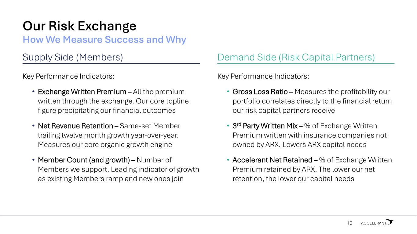 9 Our Risk Exchange What We Do Members (Typically MGAs) Risk Capital Partners (Insurers, Reinsurers, Institutional Investors) Capacity Risk Capital Risk • Accelerant identifies and onboards Members, who feed the Exchange by underwriting premium • Accelerant’s technological capabilities and approach enable ongoing monitoring of Members and additional growth (distribution, pricing, new products, etc.) • Premium written on or through a primary insurance company (Accelerant-owned or 3rd party) • After accounting for reinsurance, risk ultimately retained by a mix of 3rd party Risk Capital Partners, 3rd Party Risk Exchange Insurers, and Accelerant-owned entities Data, Analytics, & AI Digital Platform Expert Service Model Exchange Services fixed % fee of premium Accelerant paid by risk capital for sourcing, managing, and monitoring the portfolio