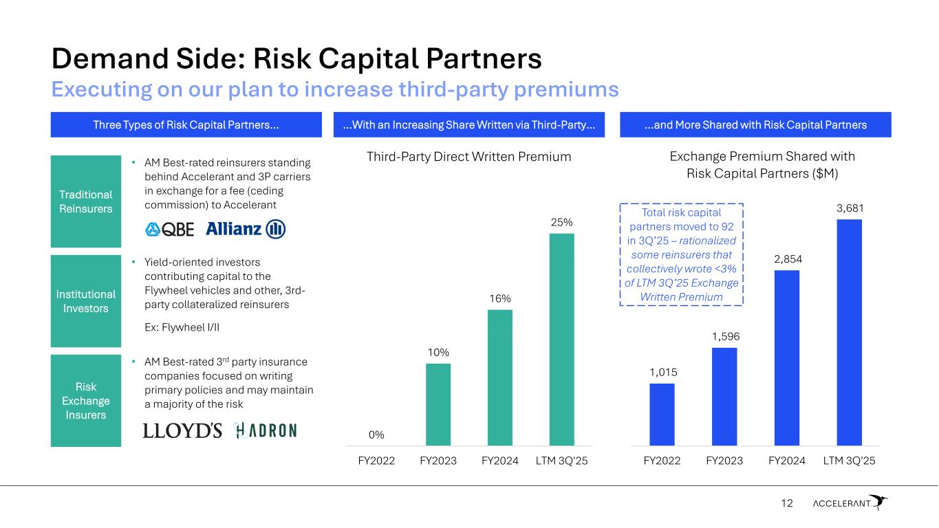 427 526 492 511 535 130 440 695 983 1,177235 407 572 641 193 666 814 375 640 173 264 557 1,201 1,787 3,108 3,980 2020 2021 2022 2023 2024 LTM 3Q'25 Exchange Written Premium ($M) by Member Cohort 2020 & Prior 2021 2022 2023 2024 2025 11 Supply Side: Existing Members Drive Embedded Growth How We Grow + New Member Additions (+17 in 3Q’25) + Net Revenue Retention (same-set Members y/y growth +135%): + Member Growth – Existing Product: Our Members are able to grow volumes on existing products because they have the support and capacity they need to focus on their distribution partners + Member Growth – New Product: In the last 12 months, existing Members have moved over or launched 90 new products to the Risk Exchange + Pricing: Rate was up globally +4% year-to-date Strong embedded organic growth with 80%+ driven by volume vs. rate historically (1) 1. 2023 cohort includes Member put into run-off starting in 3Q’25