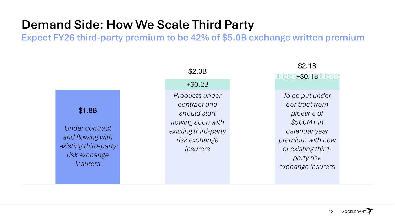 1,015 1,596 2,854 3,681 FY2022 FY2023 FY2024 LTM 3Q'25 Exchange Premium Shared with Risk Capital Partners ($M) 12 Demand Side: Risk Capital Partners Executing on our plan to increase third-party premiums Three Types of Risk Capital Partners… …With an Increasing Share Written via Third-Party… …and More Shared with Risk Capital Partners Traditional Reinsurers Institutional Investors Risk Exchange Insurers • AM Best-rated reinsurers standing behind Accelerant and 3P carriers in exchange for a fee (ceding commission) to Accelerant • Yield-oriented investors contributing capital to the Flywheel vehicles and other, 3rd- party collateralized reinsurers Ex: Flywheel I/II • AM Best-rated 3rd party insurance companies focused on writing primary policies and may maintain a majority of the risk 0% 10% 16% 25% FY2022 FY2023 FY2024 LTM 3Q'25 Third-Party Direct Written Premium Total risk capital partners moved to 92 in 3Q’25 – rationalized some reinsurers that collectively wrote <3% of LTM 3Q’25 Exchange Written Premium