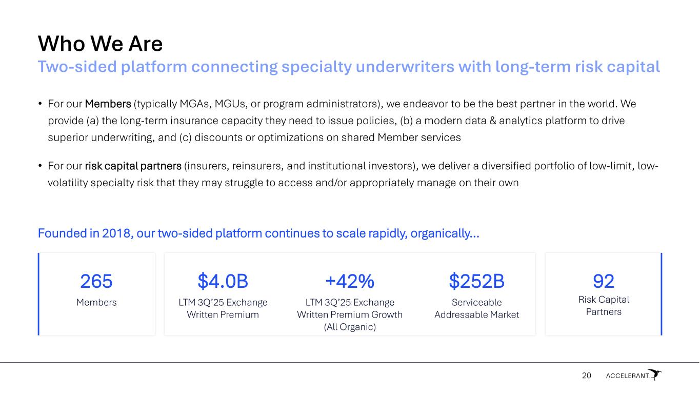 Who We Are 1,201 1,787 3,108 3,980 219 344 603 855 (39) 36 113 258 2022 2023 2024 LTM 3Q'25 Financials ($M) Exchange Written Premium Revenue Adj. EBITDA Premium Growth 116% 49% 74% 42% Revenue Growth 118% 57% 75% 66% Adj. EBITDA Margin -18% 10% 19% 30% Members (Typically MGAs) Risk Capital Partners (Insurers, Reinsurers, Institutional Investors) Capacity Risk Capital Risk Data, Analytics, & AI Digital Platform Expert Service Model Two-sided platform connecting specialty underwriters with long-term risk capital 8% Exchange Services fixed % fee of premium Our Founding Theses: Disaggregated specialist underwriters (MGAs, MGUs, etc.) will outcompete monolithic insurance companies Modern technology will power superior control and influence of underwriting and unlock accelerating economies of scale Large swaths of risk capital want access to a diversified portfolio of low-limit, low-volatility specialty risk, but can’t do it themselves 1 2 3 Notes: Please see the Appendix for reconciliations of non-GAAP items. 19