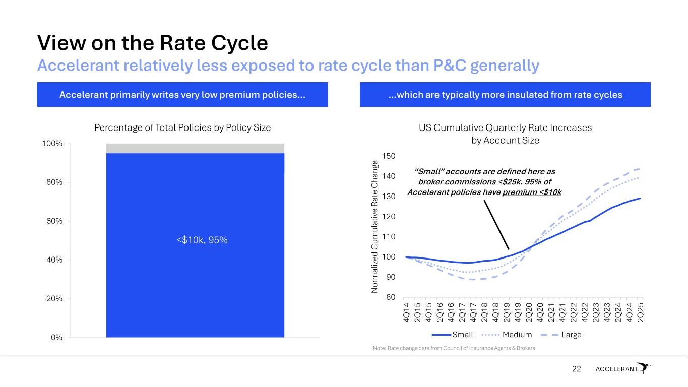 80 90 100 110 120 130 140 150 4Q 14 2Q 15 4Q 15 2Q 16 4Q 16 2Q 17 4Q 17 2Q 18 4Q 18 2Q 19 4Q 19 2Q 20 4Q 20 2Q 21 4Q 21 2Q 22 4Q 22 2Q 23 4Q 23 2Q 24 4Q 24 2Q 25 N or m al ize d C um ul at ive R at e C ha ng e US Cumulative Quarterly Rate Increases by Account Size Small Medium Large Note: Rate change data from Council of Insurance Agents & Brokers 22 View on the Rate Cycle Accelerant relatively less exposed to rate cycle than P&C generally Accelerant primarily writes very low premium policies… …which are typically more insulated from rate cycles “Small” accounts are defined here as broker commissions <$25k. 95% of Accelerant policies have premium <$10k 0% 20% 40% 60% 80% 100% Percentage of Total Policies by Policy Size <$10k, 95%
