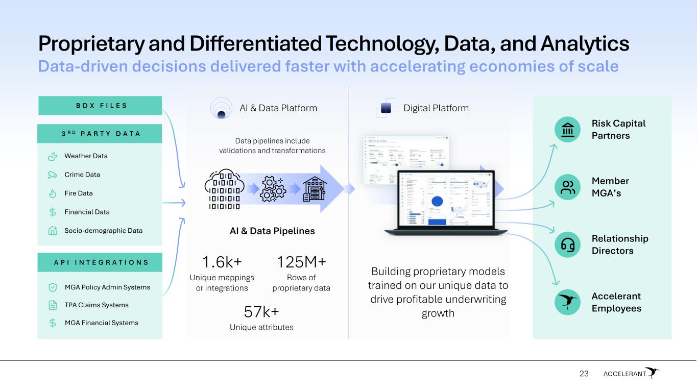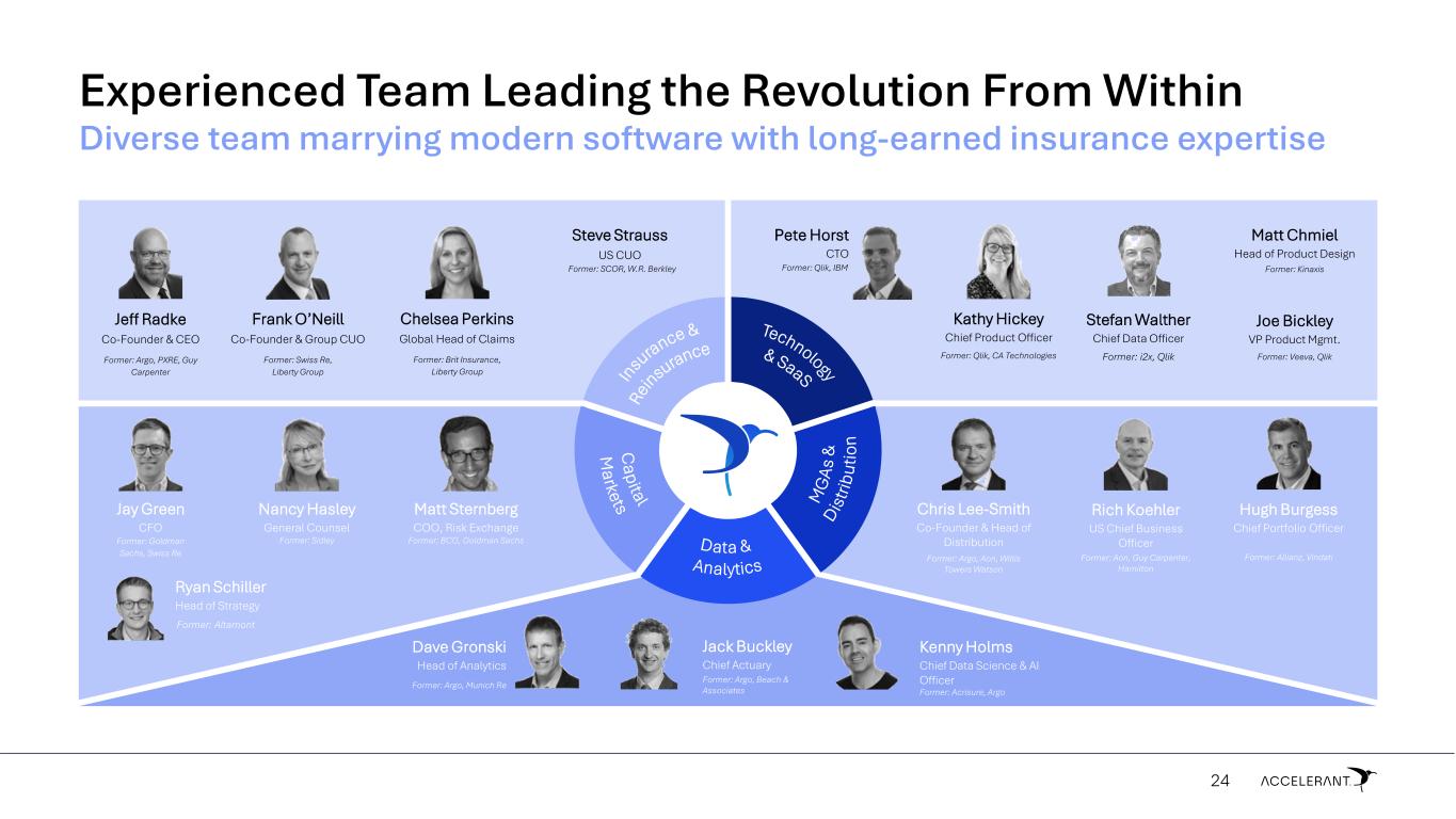 k 23 Proprietary and Differentiated Technology, Data, and Analytics Weather Data Crime Data Fire Data Financial Data Socio-demographic Data MGA Policy Admin Systems TPA Claims Systems MGA Financial Systems Risk Capital Partners Member MGA’s Relationship Directors Accelerant Employees AI & Data Platform Digital Platform Data pipelines include validations and transformations AI & Data Pipelines Data-driven decisions delivered faster with accelerating economies of scale 1.6k+ Unique mappings or integrations 125M+ Rows of proprietary data 57k+ Unique attributes Building proprietary models trained on our unique data to drive profitable underwriting growth