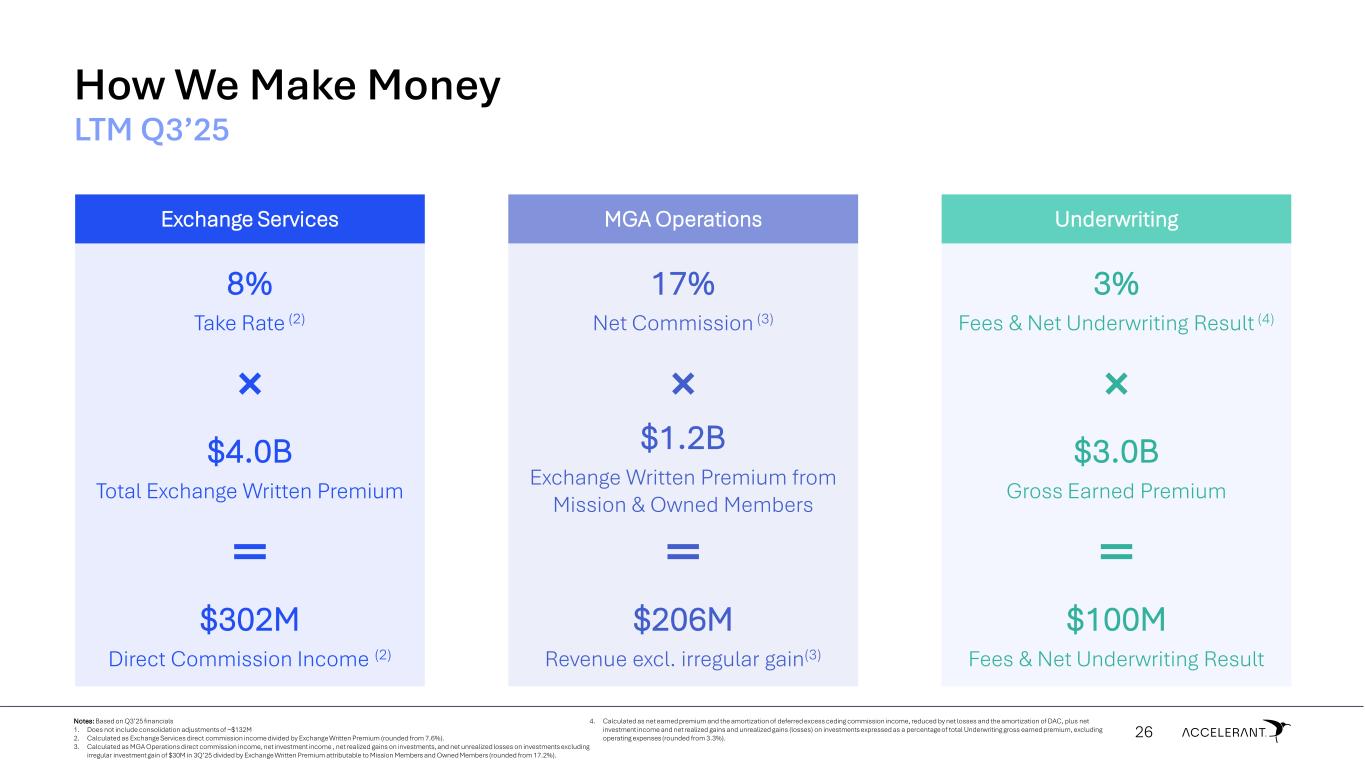 25 How We Make Money Risk Capital Pays us to source, manage, and monitor specialty risk Notes: Based on LTM Q3’25 financials; does not include consolidation adjustments of ~$132M 1. Calculated as MGA Operations direct commission income, net investment income , net realized gains on investments, and net unrealized losses on investments excluding irregular investment gain of $30M in 3Q’25 divided by Exchange Written Premium attributable to Mission Members and Owned Members. 2. Calculated as Exchange Services direct commission income divided by Exchange Written Premium. 3. Calculated as net earned premium and the amortization of deferred excess ceding commission income, reduced by net losses and the amortization of DAC, plus net investment income and net realized gains and unrealized gains (losses) on investments expressed as a percentage of total Underwriting gross earned premium, excluding operating expenses. 4. Premiums written but not incepted yet are not recorded in Exchange Written Premium until they incept. Independent Members Mission Members Owned Members $2,796M 42% Y/Y $445M 16% Y/Y $739M 61% Y/Y 17% MGA Operations Net Commission (1) 8% Exchange Services Take Rate (2) Exchange Written Premium $3,980M 42% Y/Y 3% Underwriting Fees & Net Results (3) Accelerant Underwriting $3,410M Third Party Non-Accelerant Underwriting $995M 151% Y/Y $605M Third-Party Risk Capital Partners $3,112M$390M $605M $35M Written But Not Incepted (4) Commissions Net Retention $298M 7% of total